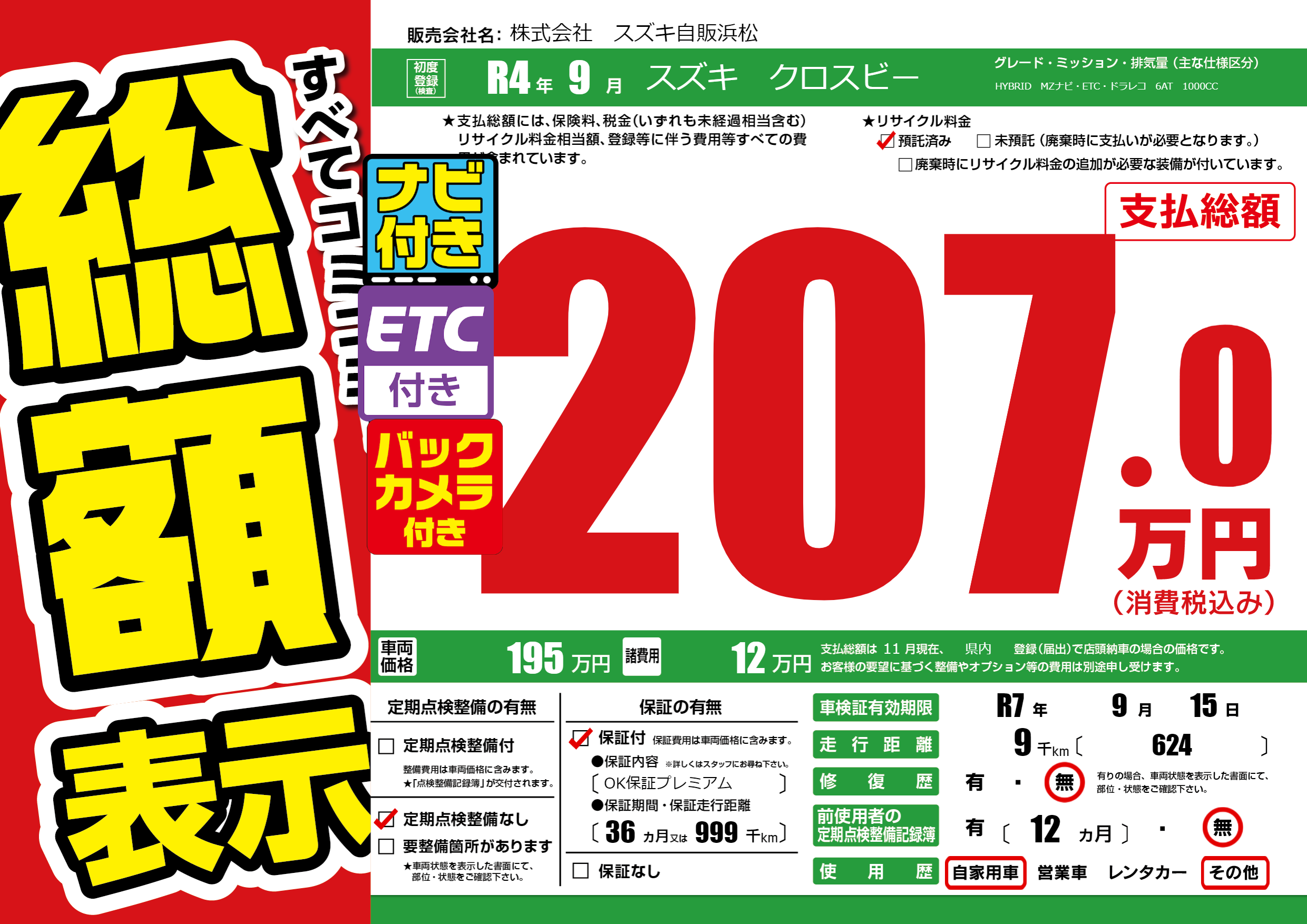 | 車名 | スズキ クロスビー | グレード ミッション 排気量 |