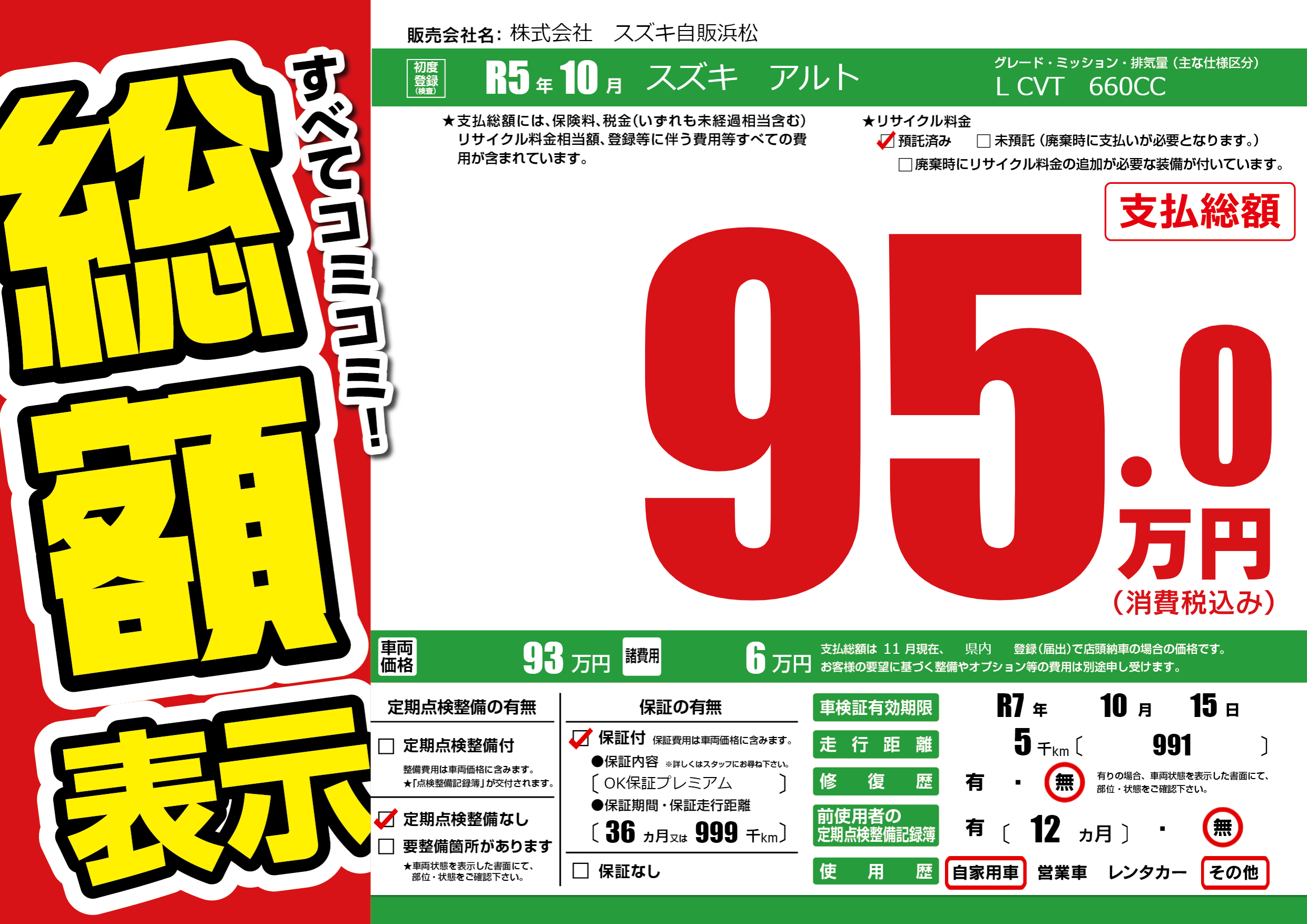 | 車名 | スズキ アルト | グレード ミッション 排気量 |