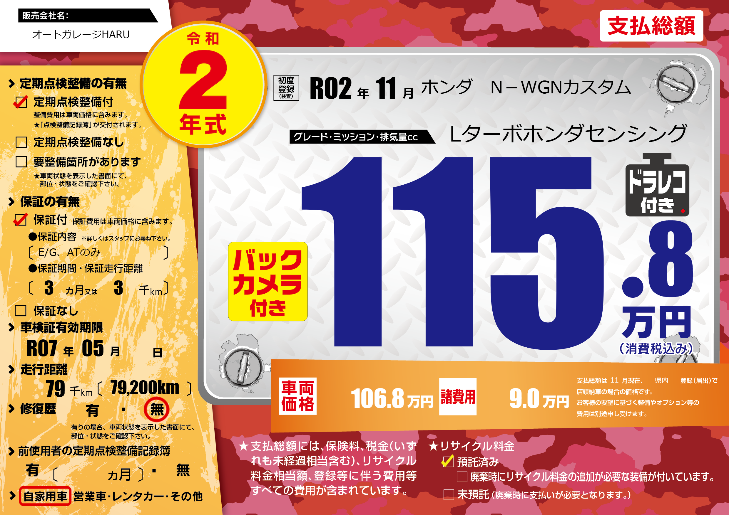 | 車名 | ホンダ N-WGNカスタム | グレード ミッション 排気量 |