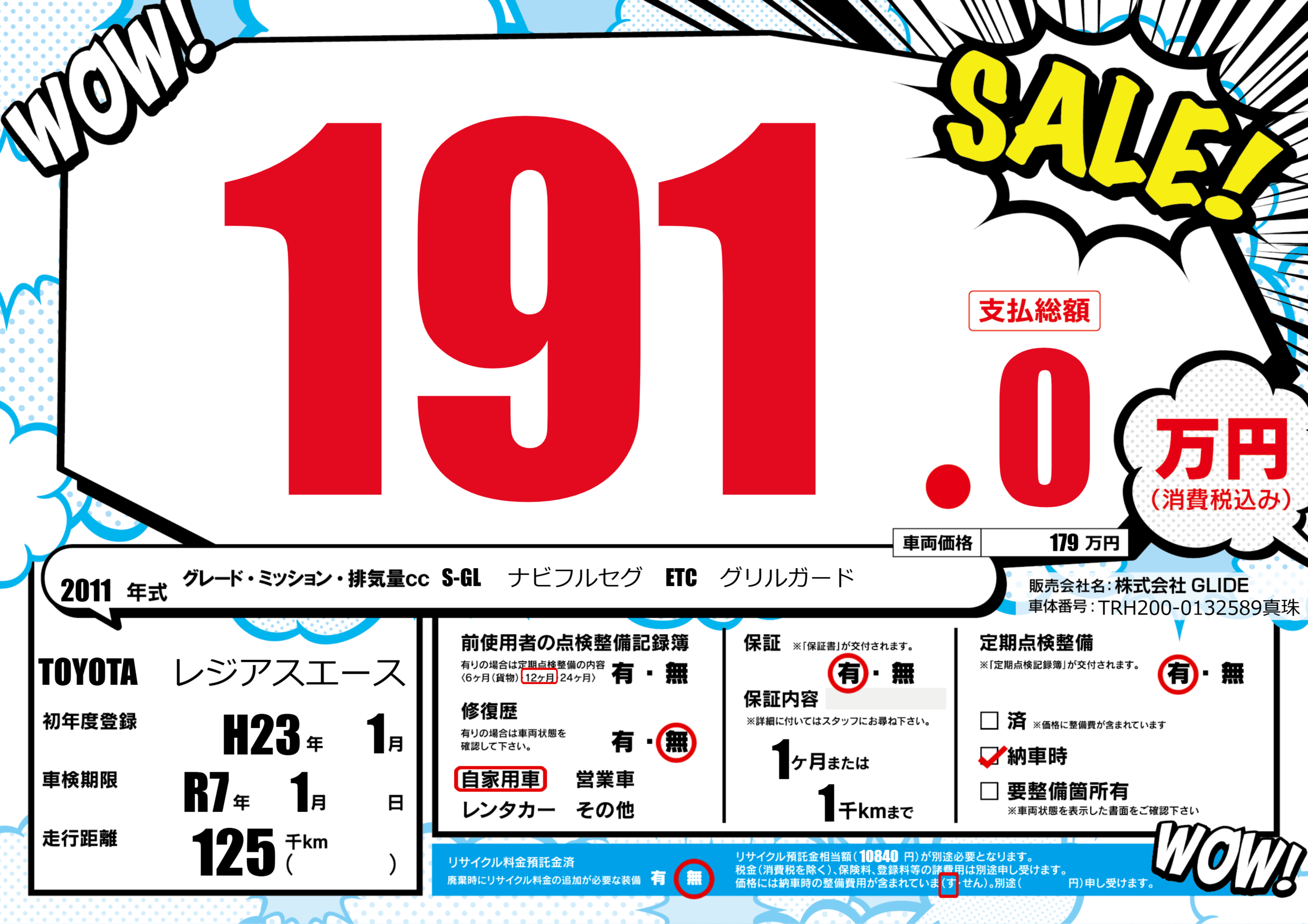 | 車名 | TOYOTA レジアスエース | グレード ミッション 排気量 |