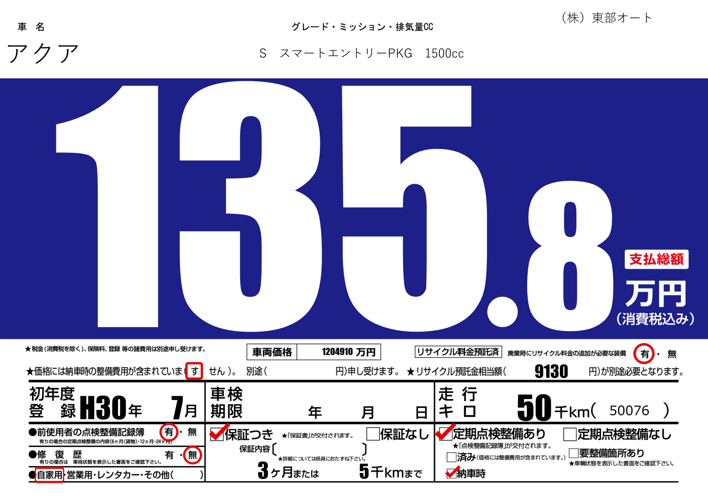 | 定期点検整備 | 定期点検整備あり 納車時あり | ||
