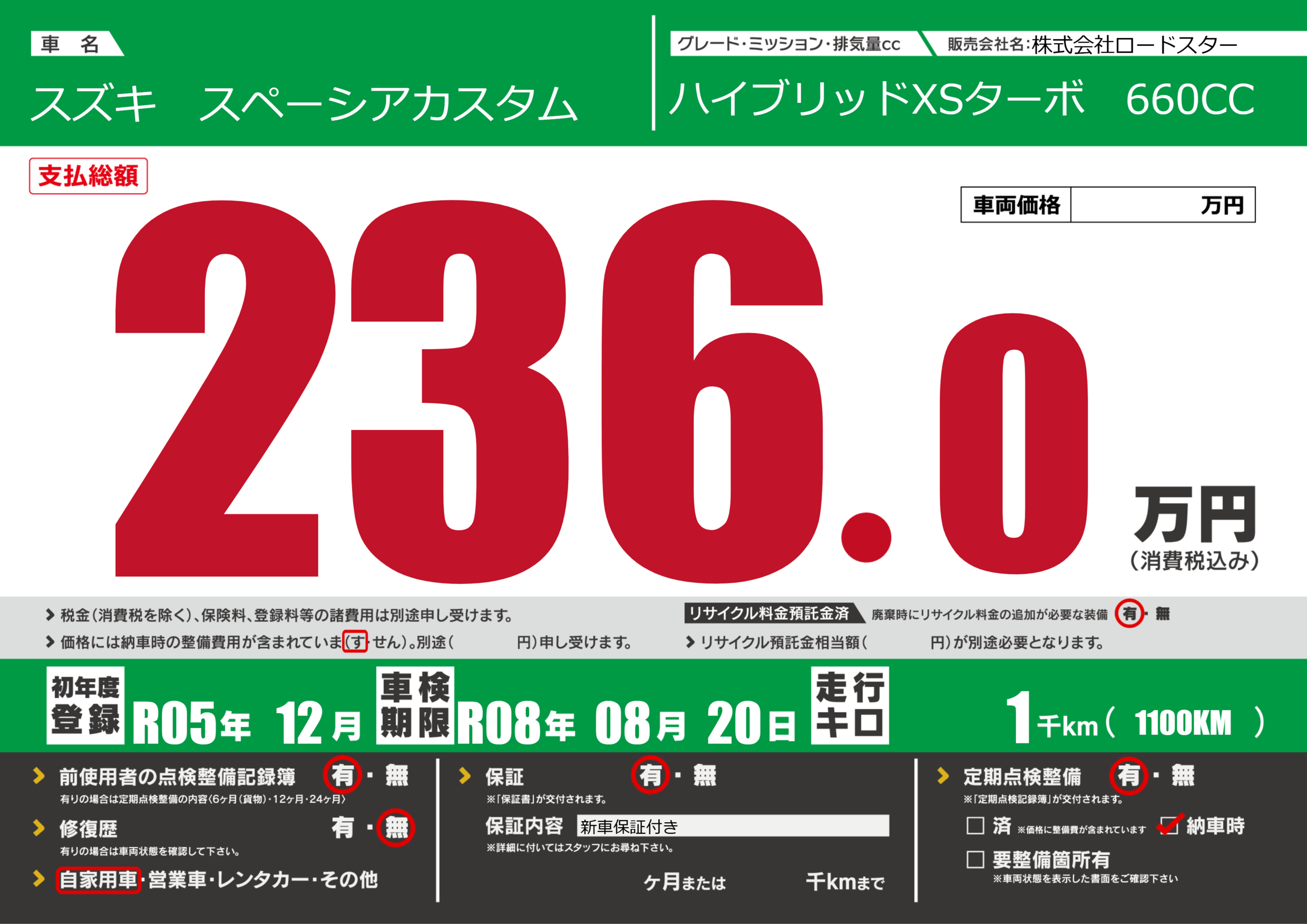 | 走行キロ | 0.1万km | 初年度登録 | R05年12月 |