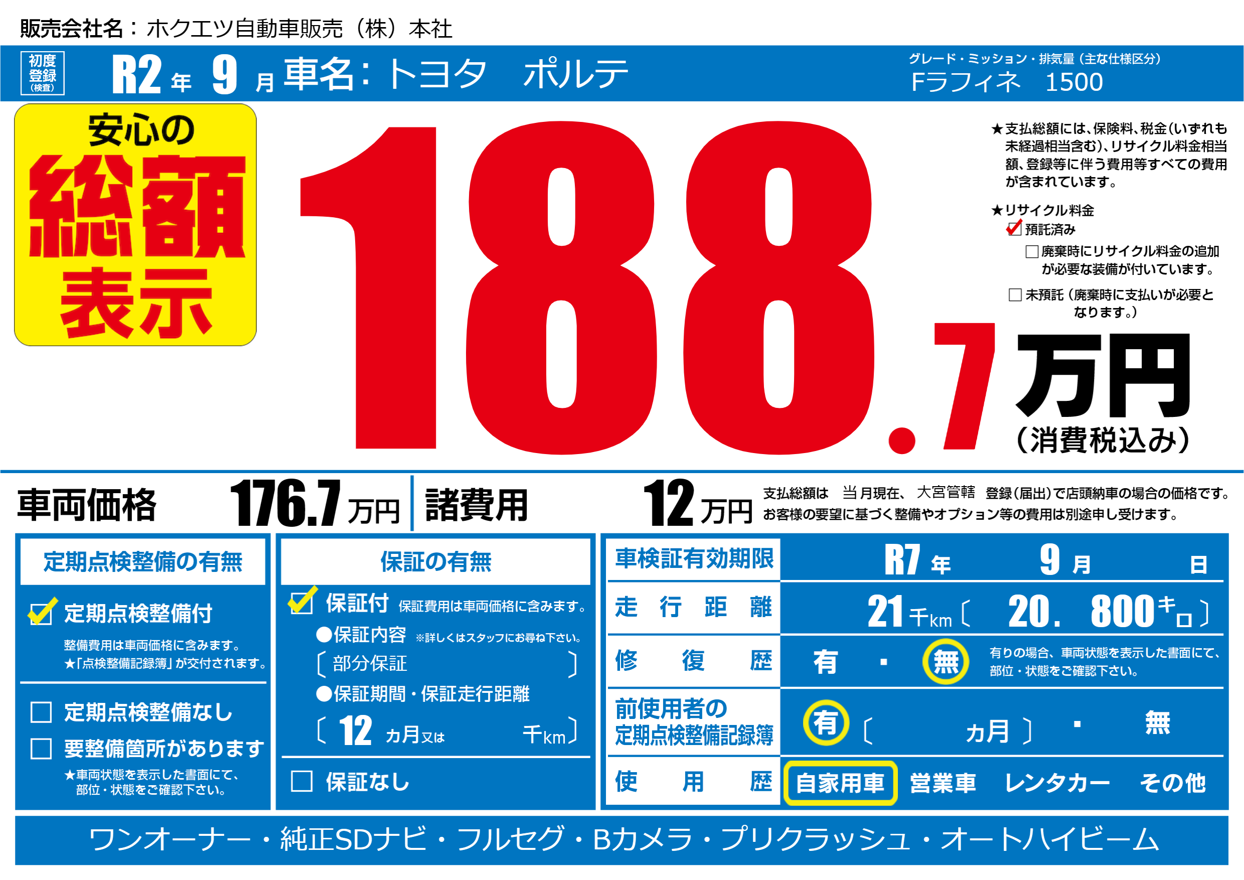 | 車検制限 | R7年 9月 - 日 | ||