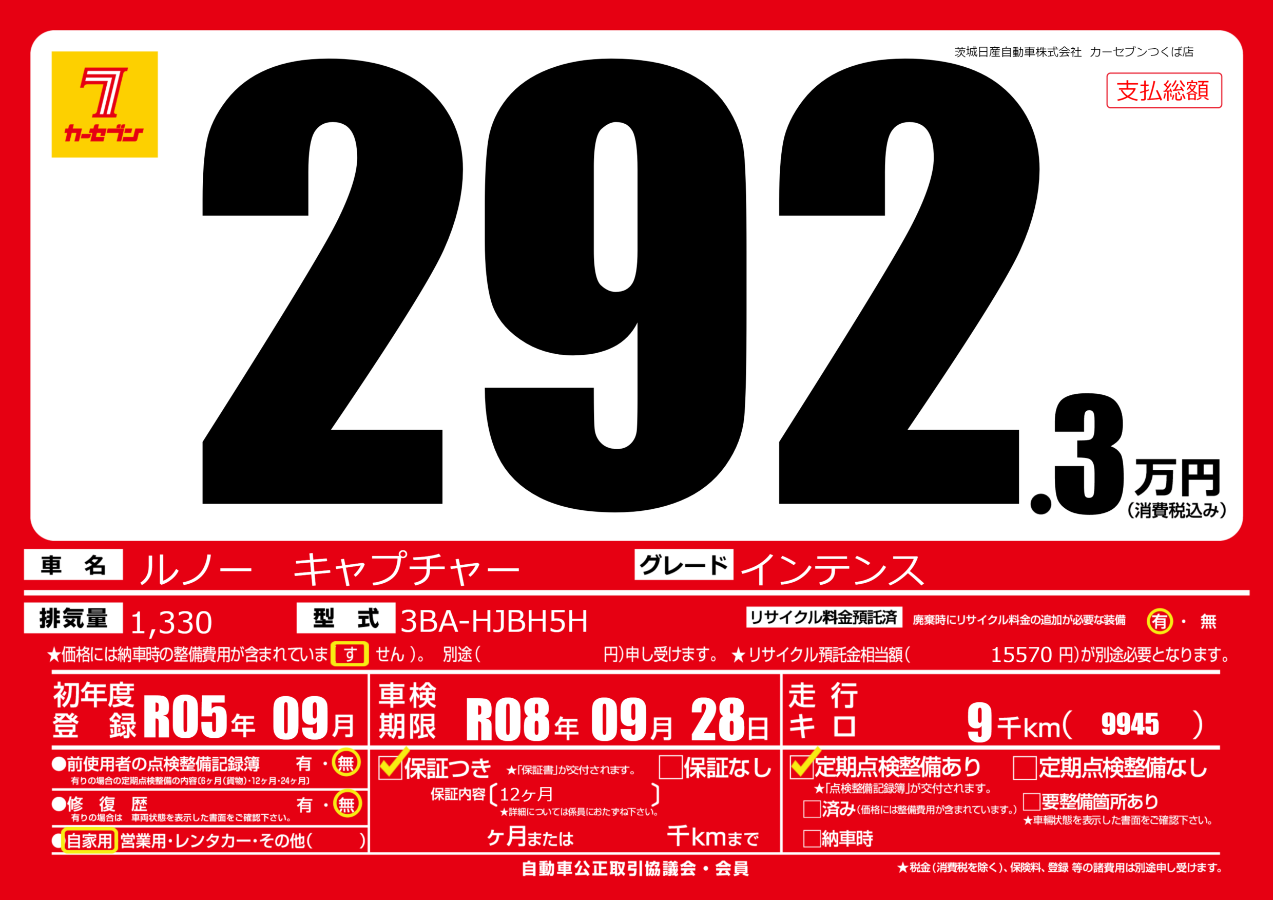| 走行キロ | 0.9万km | 初年度登録 | R05年09月 |