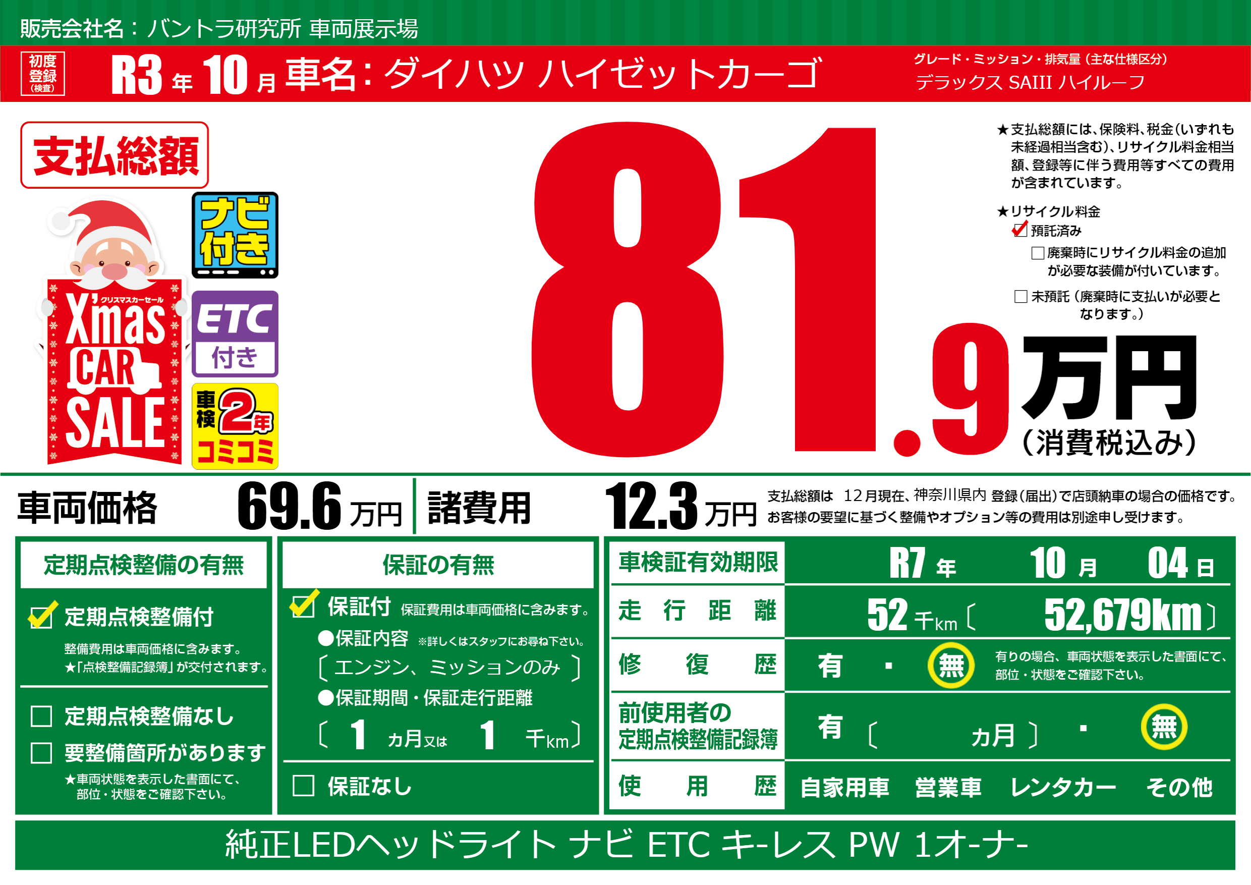 | 車名 | ダイハツ ハイゼットカーゴ | グレード ミッション 排気量 |