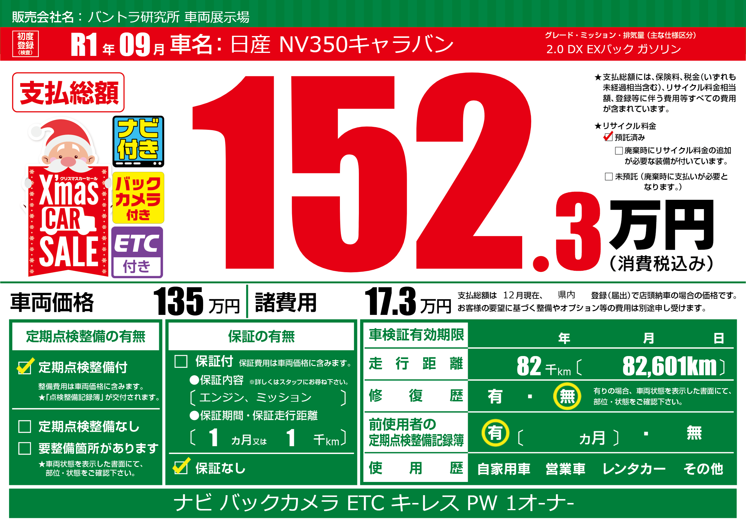 | 車名 | 日産 NV350キャラバン | グレード ミッション 排気量 |