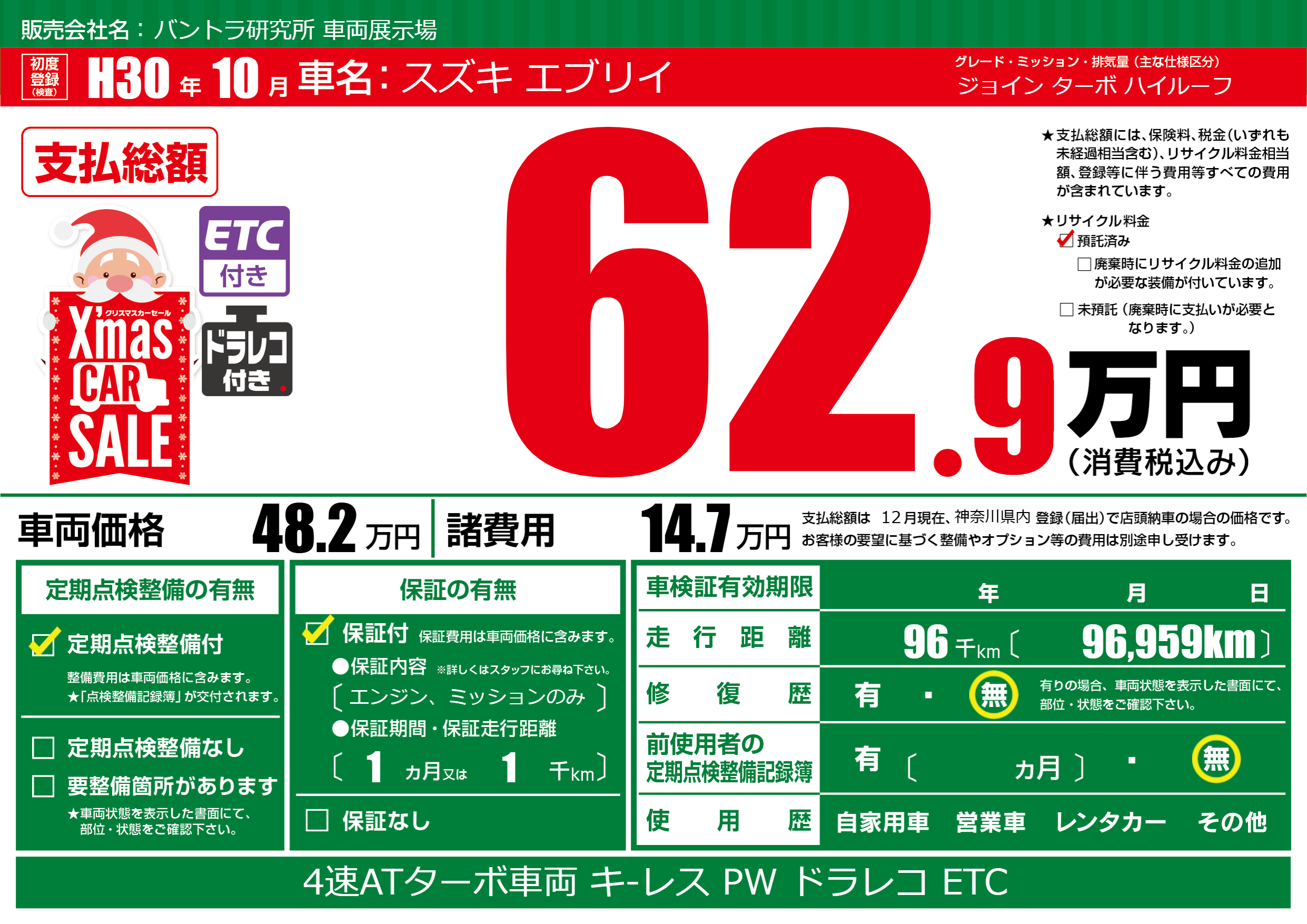 | 車名 | スズキ エブリイ | グレード ミッション 排気量 |