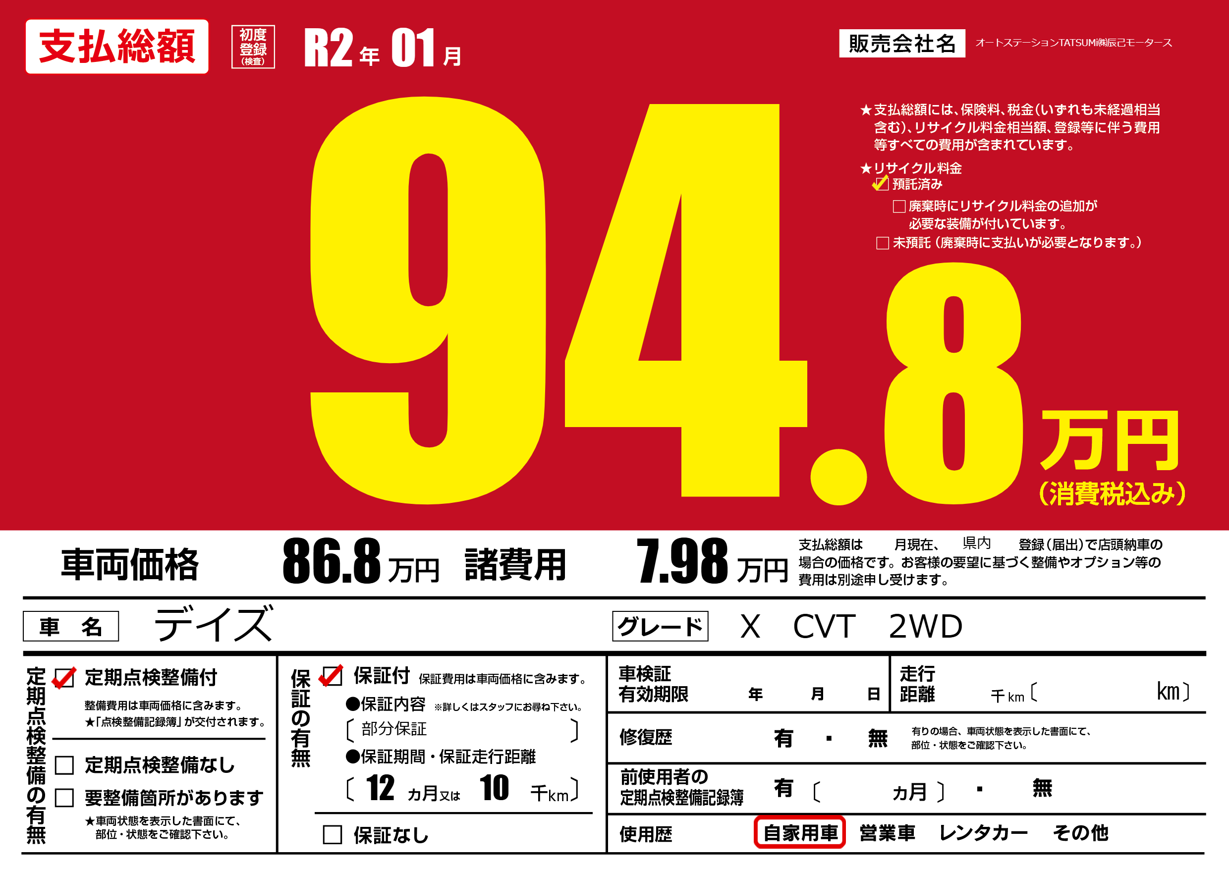 保証付き 保証内容(部分保証) 12ヶ月または(10)千kmまで |
