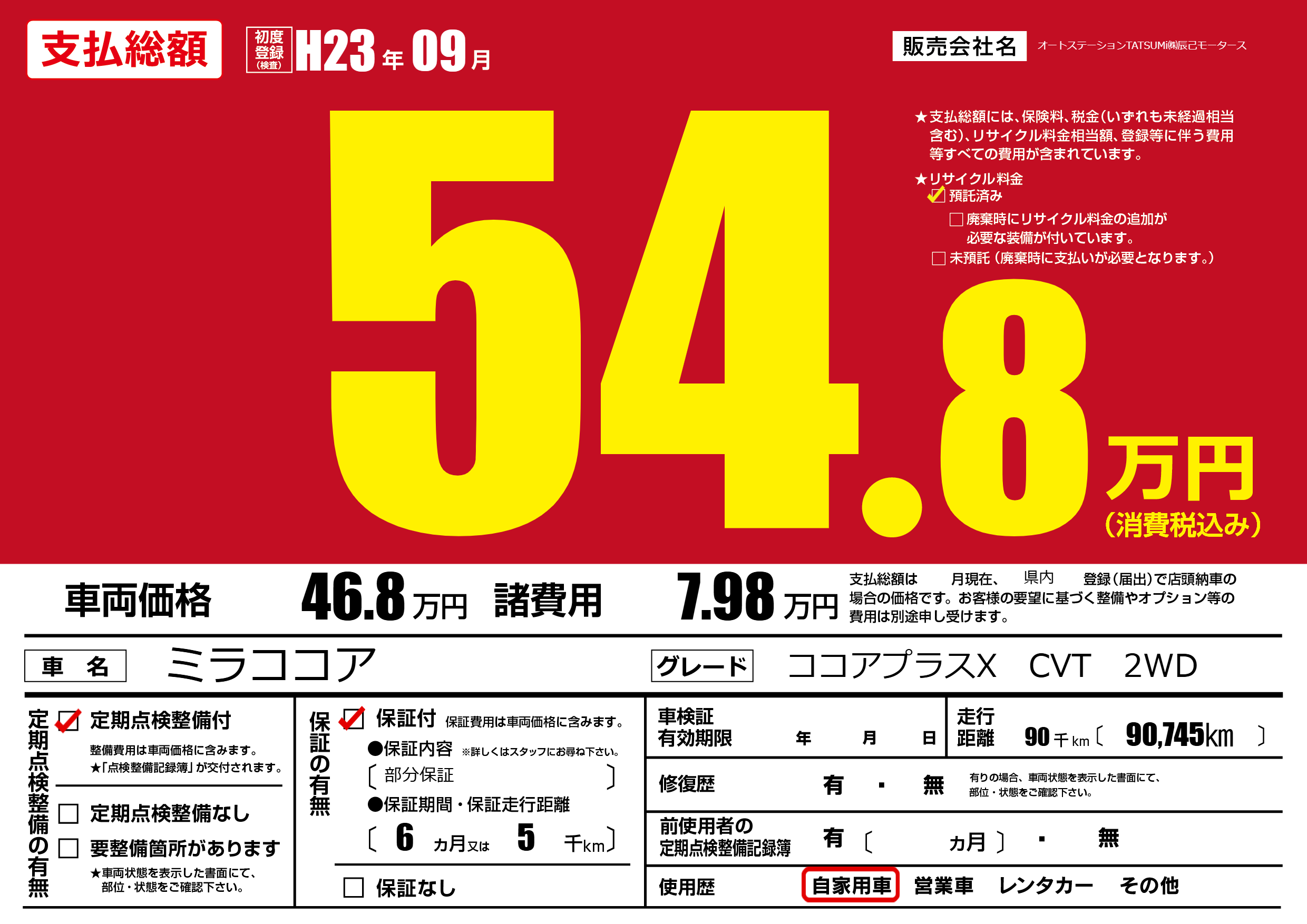 | 走行キロ | 9万km | 初年度登録 | H23年09月 |