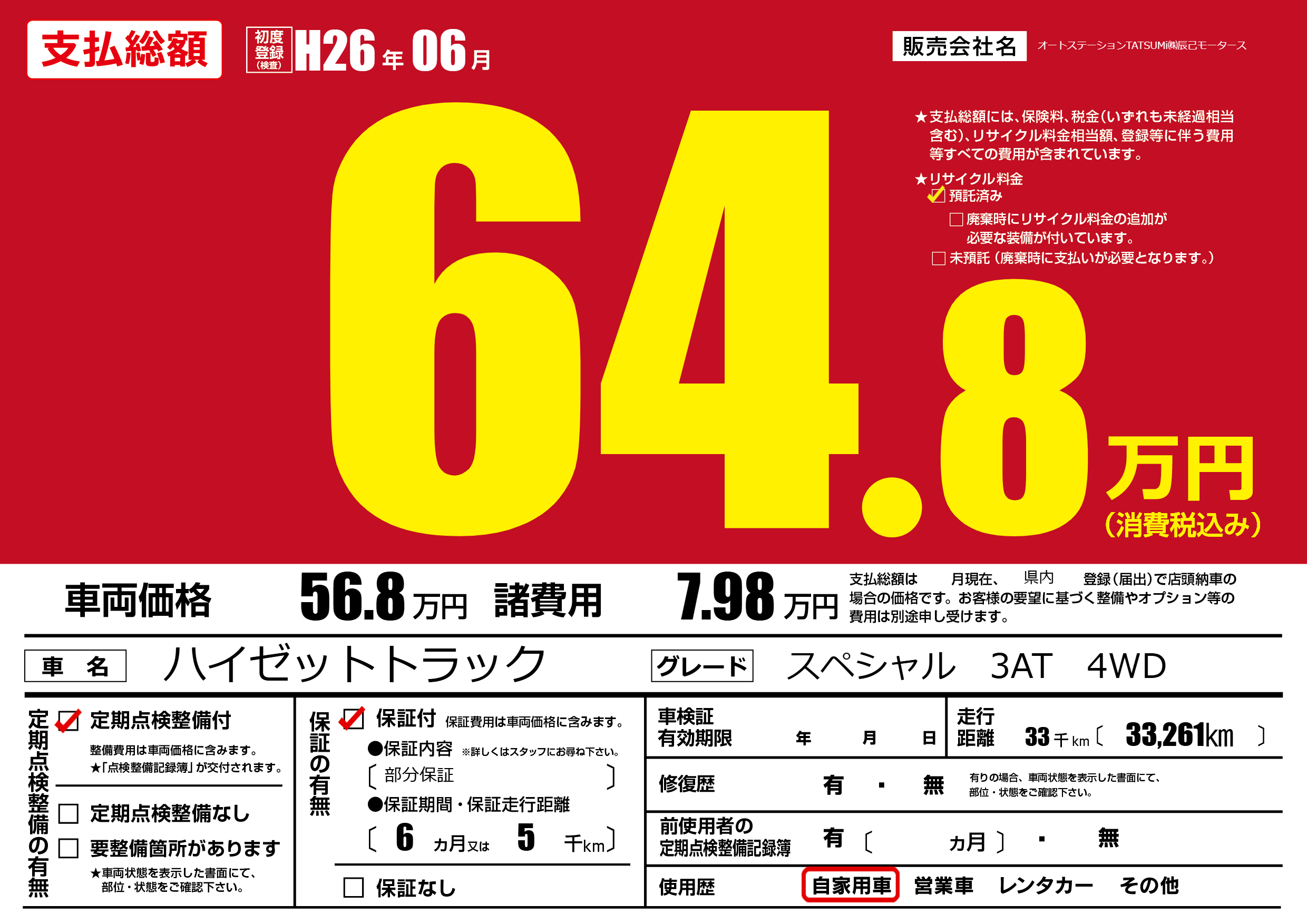 | 走行キロ | 3.3万km | 初年度登録 | H26年06月 |
