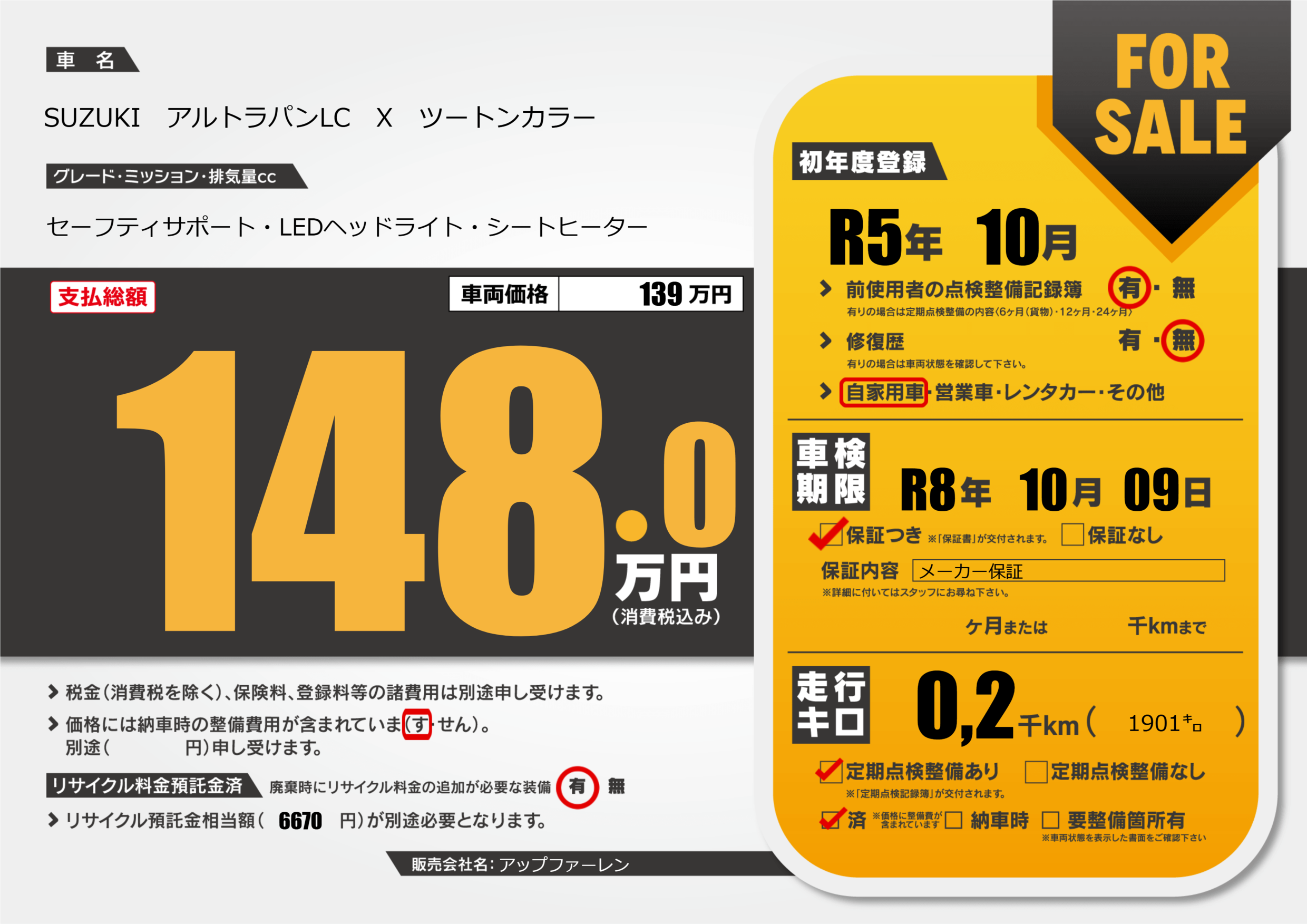 | 定期点検整備 | 定期点検整備あり 定期点検整備済み | ||