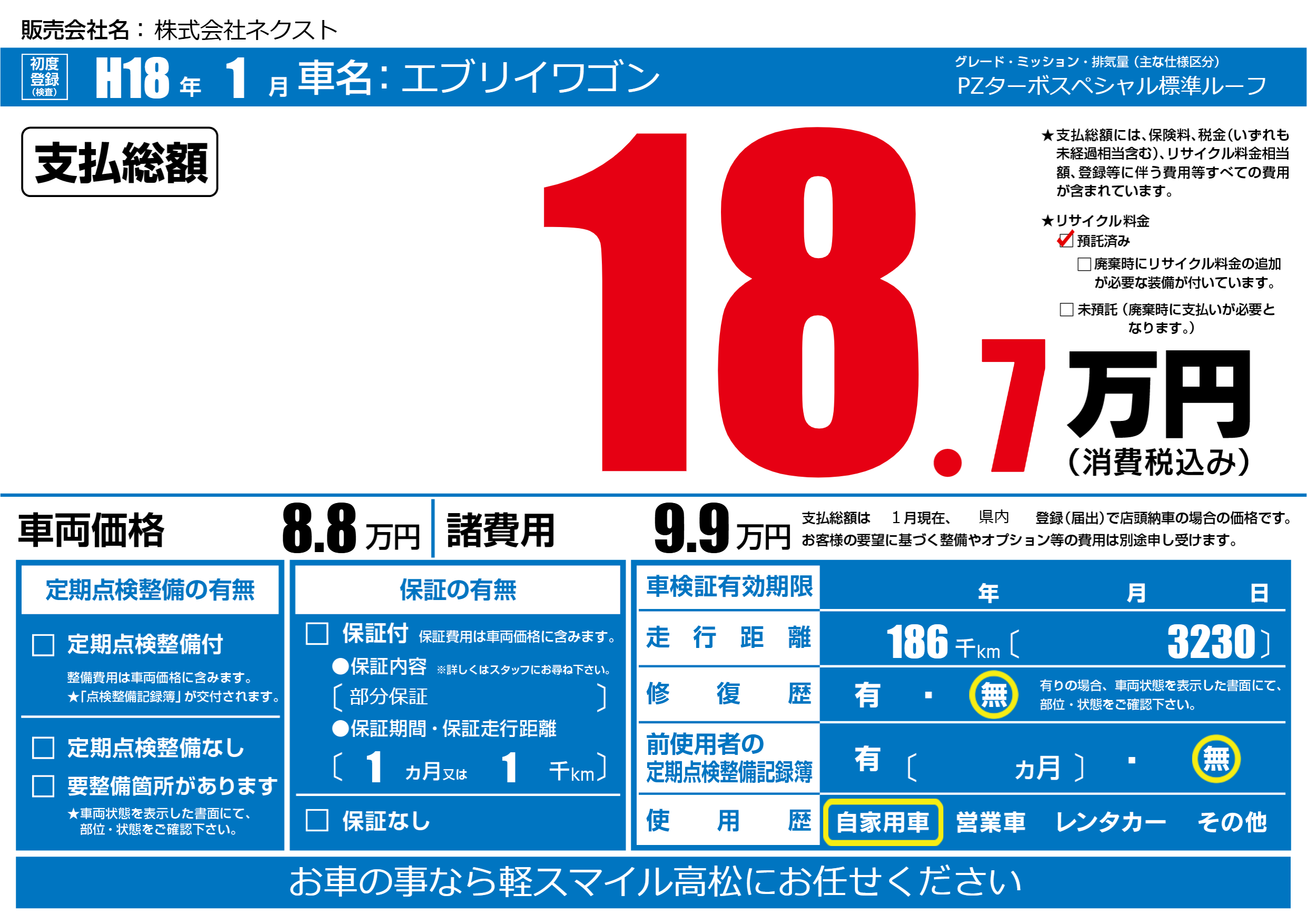 | 走行キロ | 18.6万km | 初年度登録 | H18年1月 |