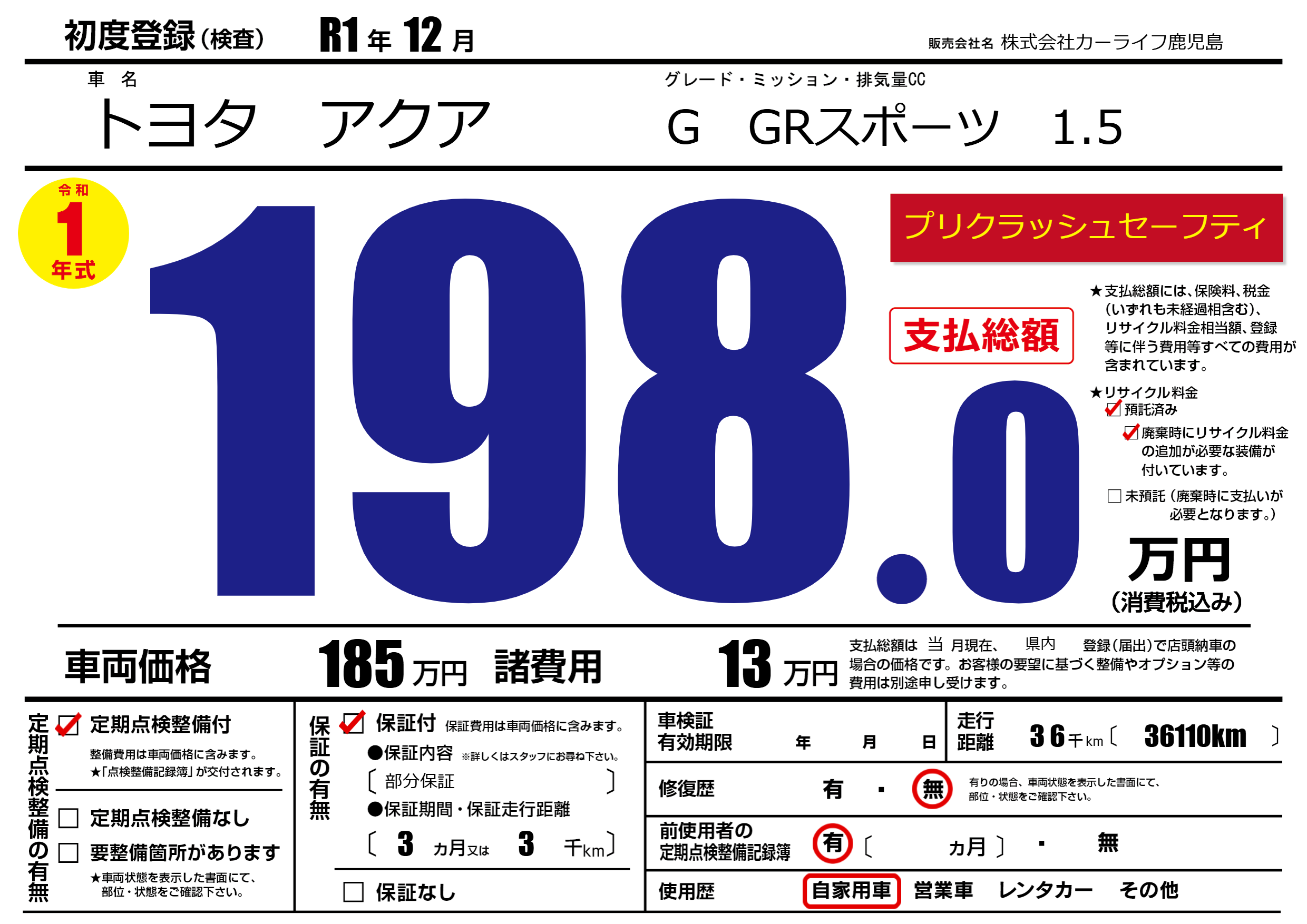 | 車名 | トヨタ アクア | グレード ミッション 排気量 |