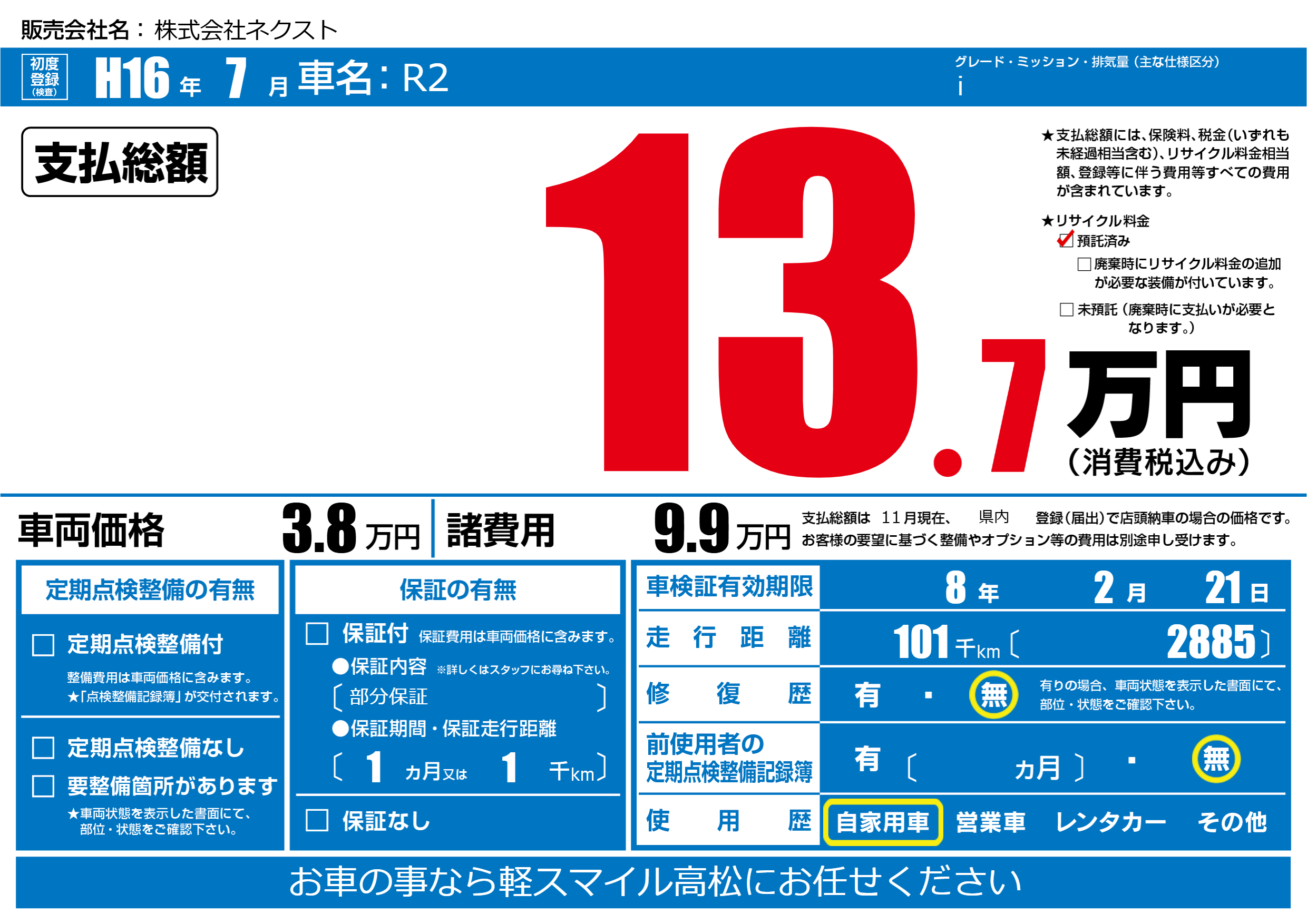 | 走行キロ | 10.1万km | 初年度登録 | H16年7月 |