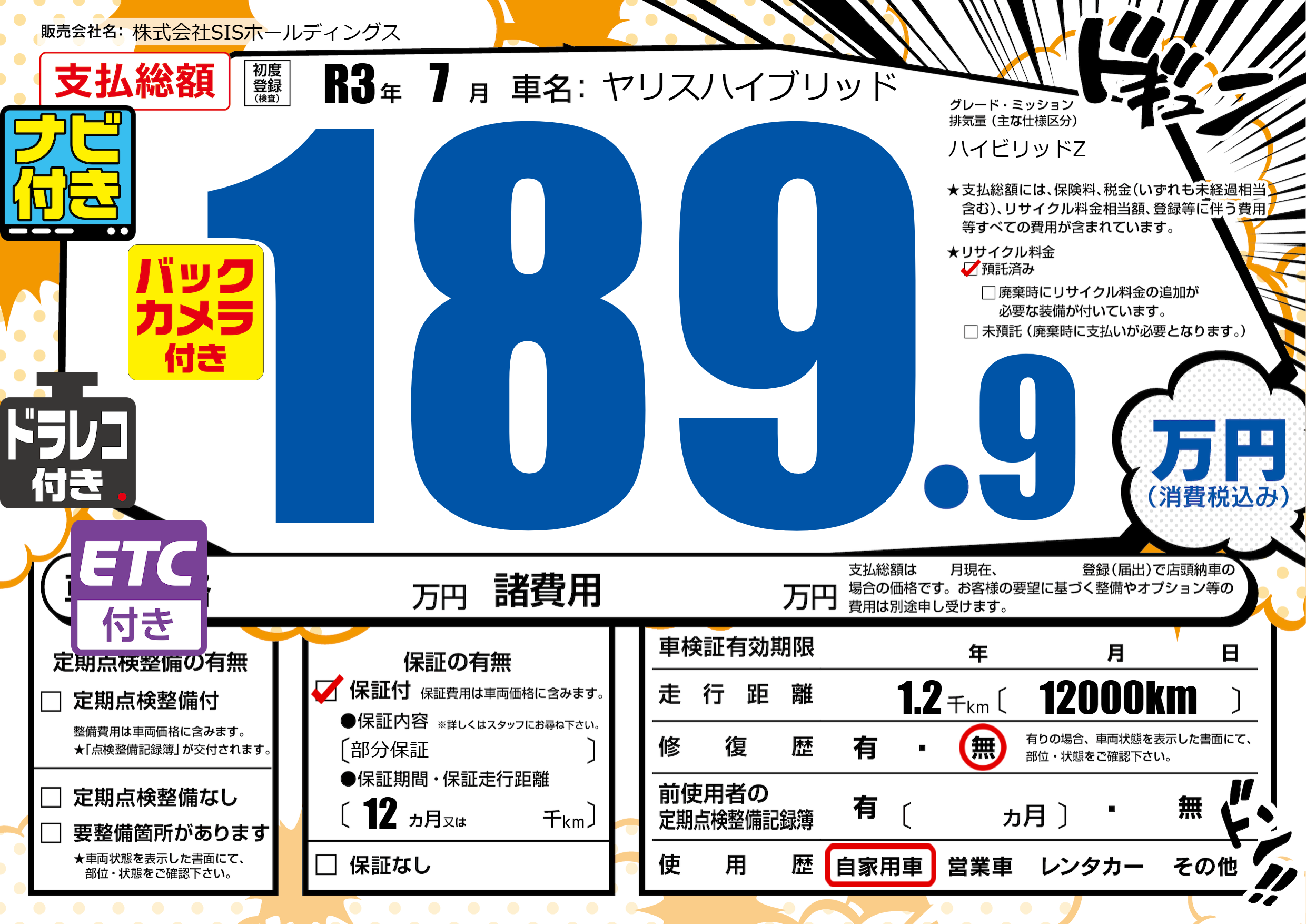 | 走行キロ | 0.1万km | 初年度登録 | R3年7月 |