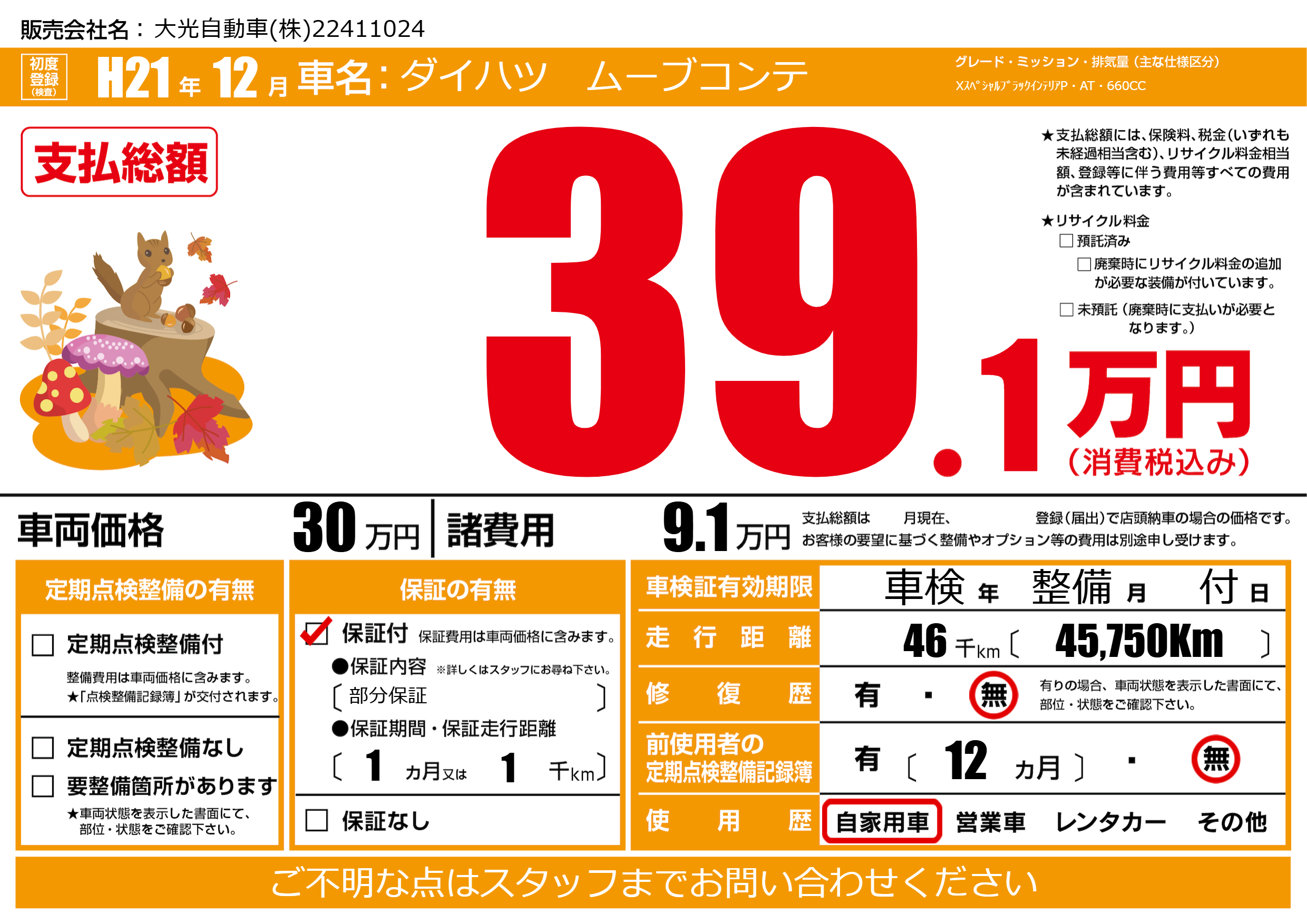 | 車名 | ダイハツ ムーブコンテ | グレード ミッション 排気量 |