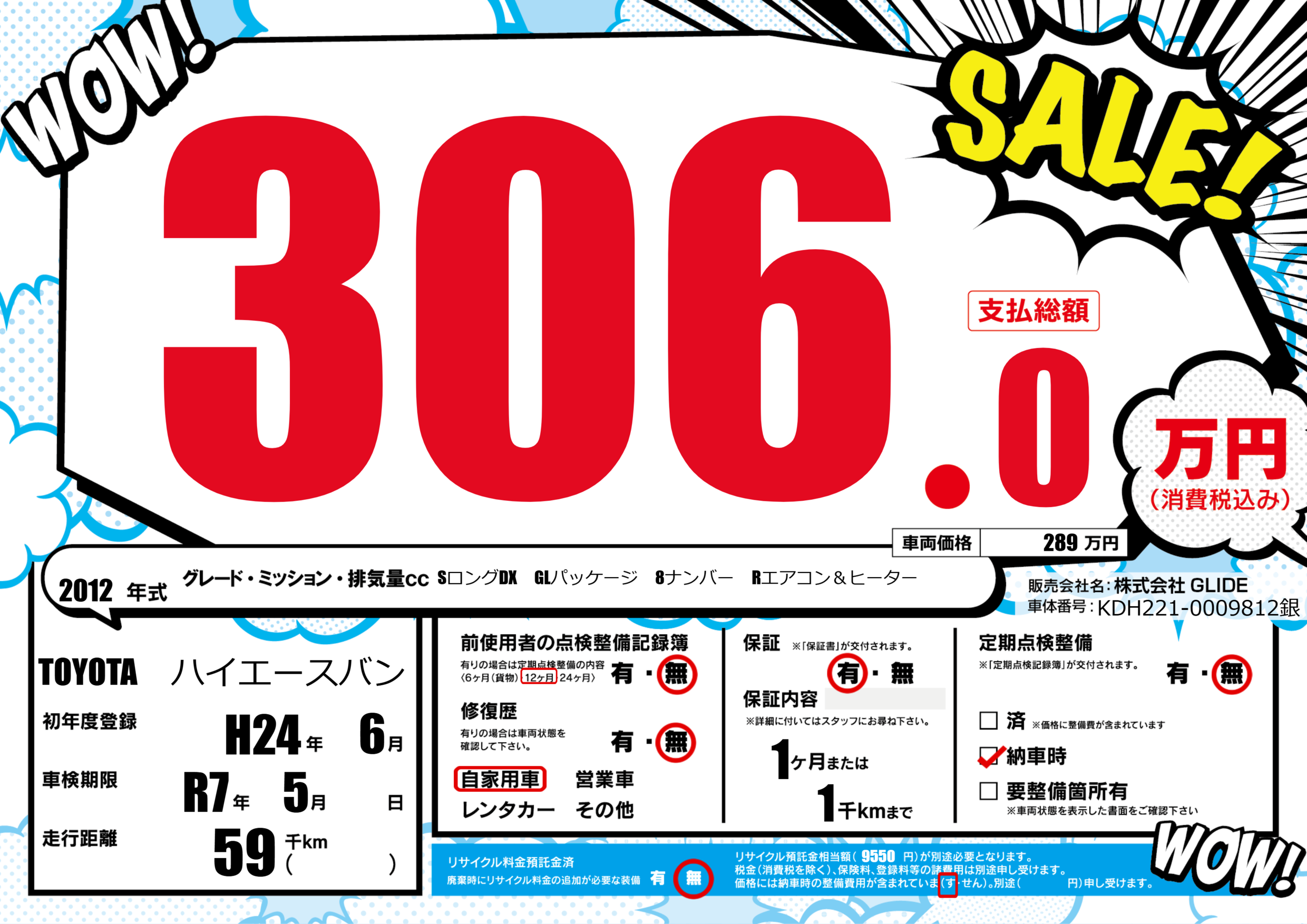 | 車名 | TOYOTA ハイエースバン | グレード ミッション 排気量 |