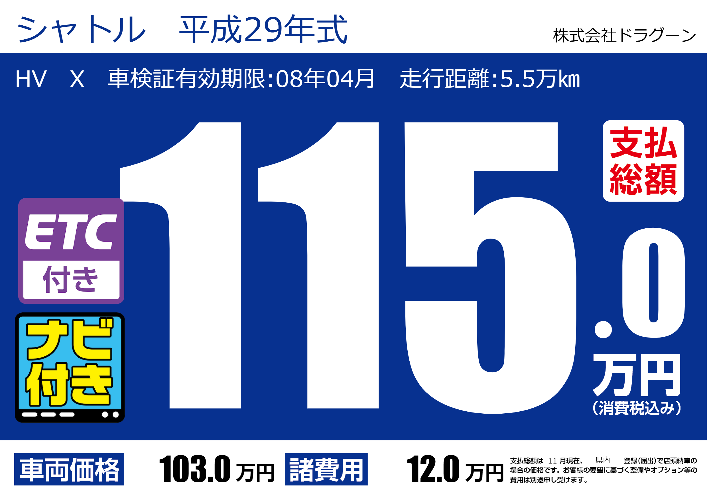 | 車名 | シャトル 平成29年式 | グレード ミッション 排気量 |