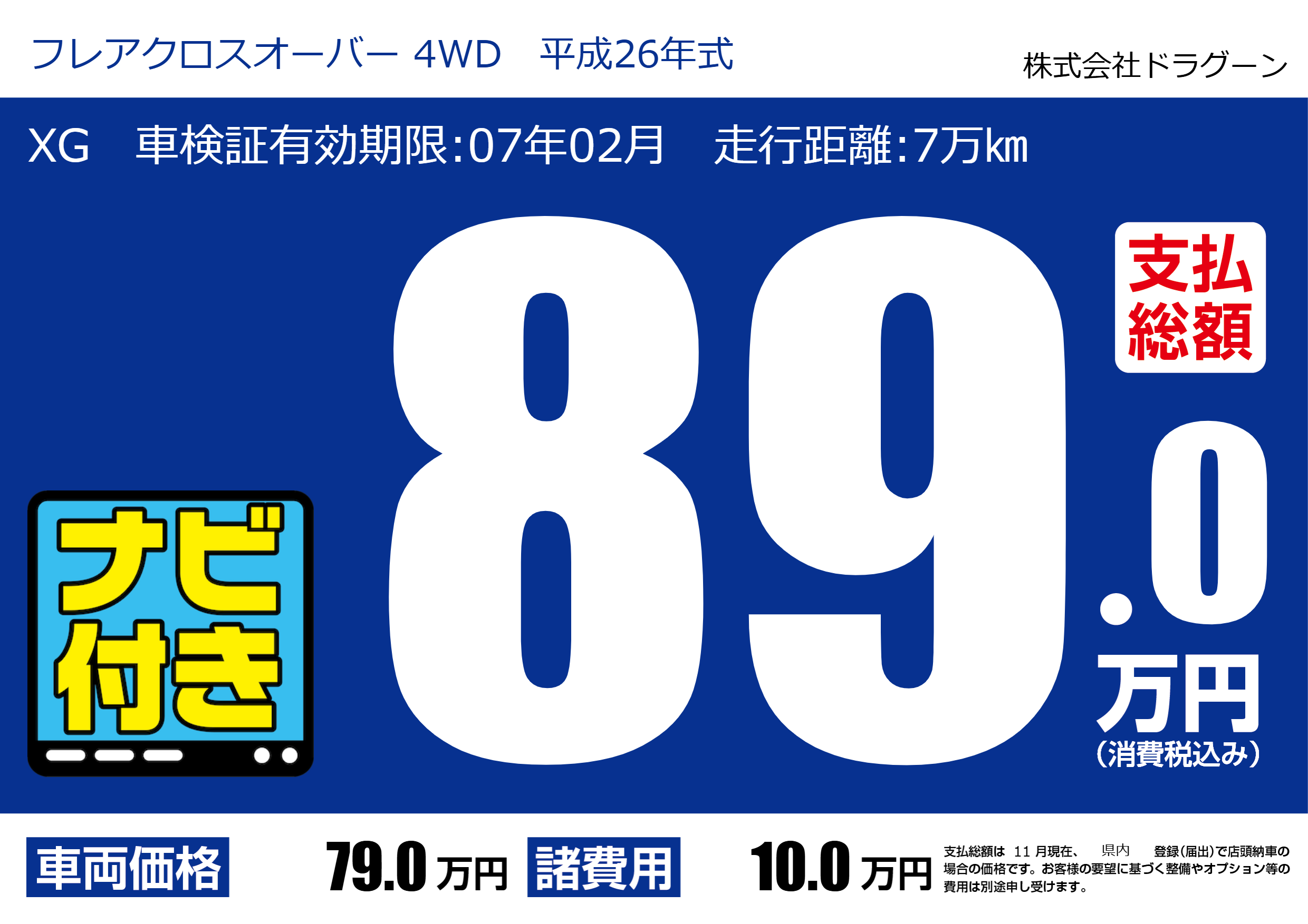 | 車名 | フレアクロスオーバー 4WD 平成26年式 | グレード ミッション 排気量 |
