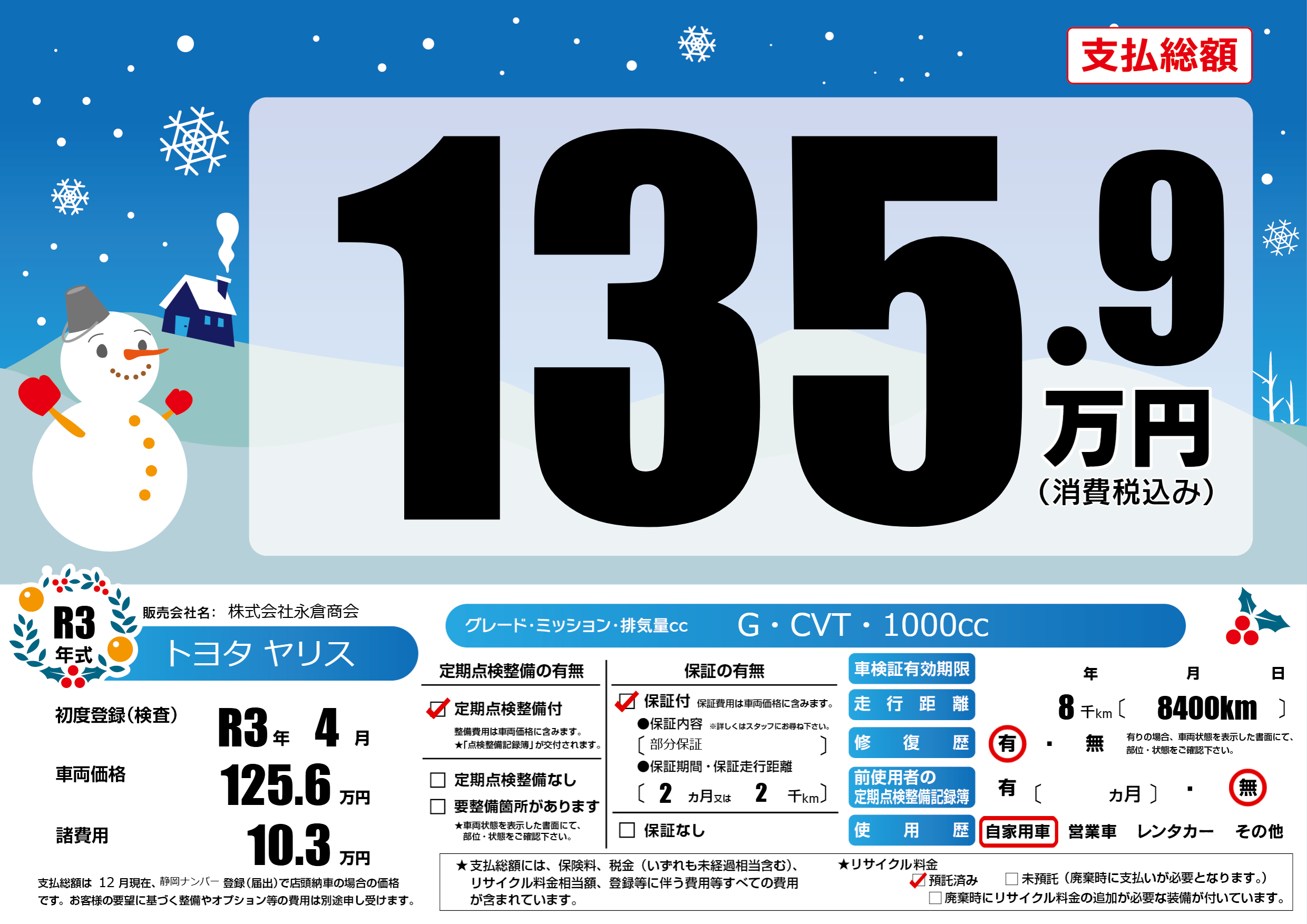 | 走行キロ | 0.8万km | 初年度登録 | R3年4月 |