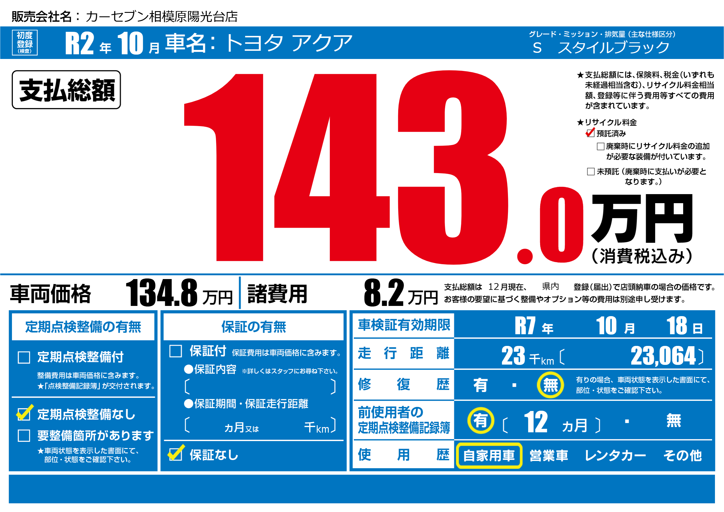 | 車名 | トヨタ アクア | グレード ミッション 排気量 |