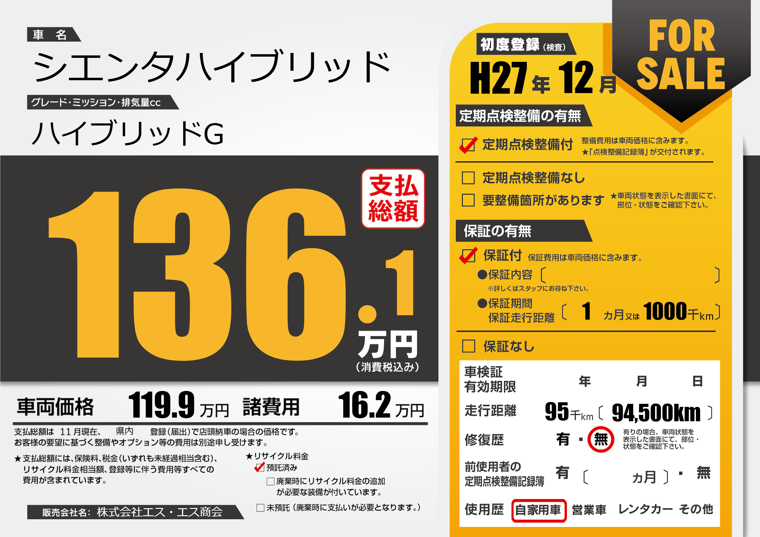 | 車名 | シエンタハイブリッド | グレード ミッション 排気量 |