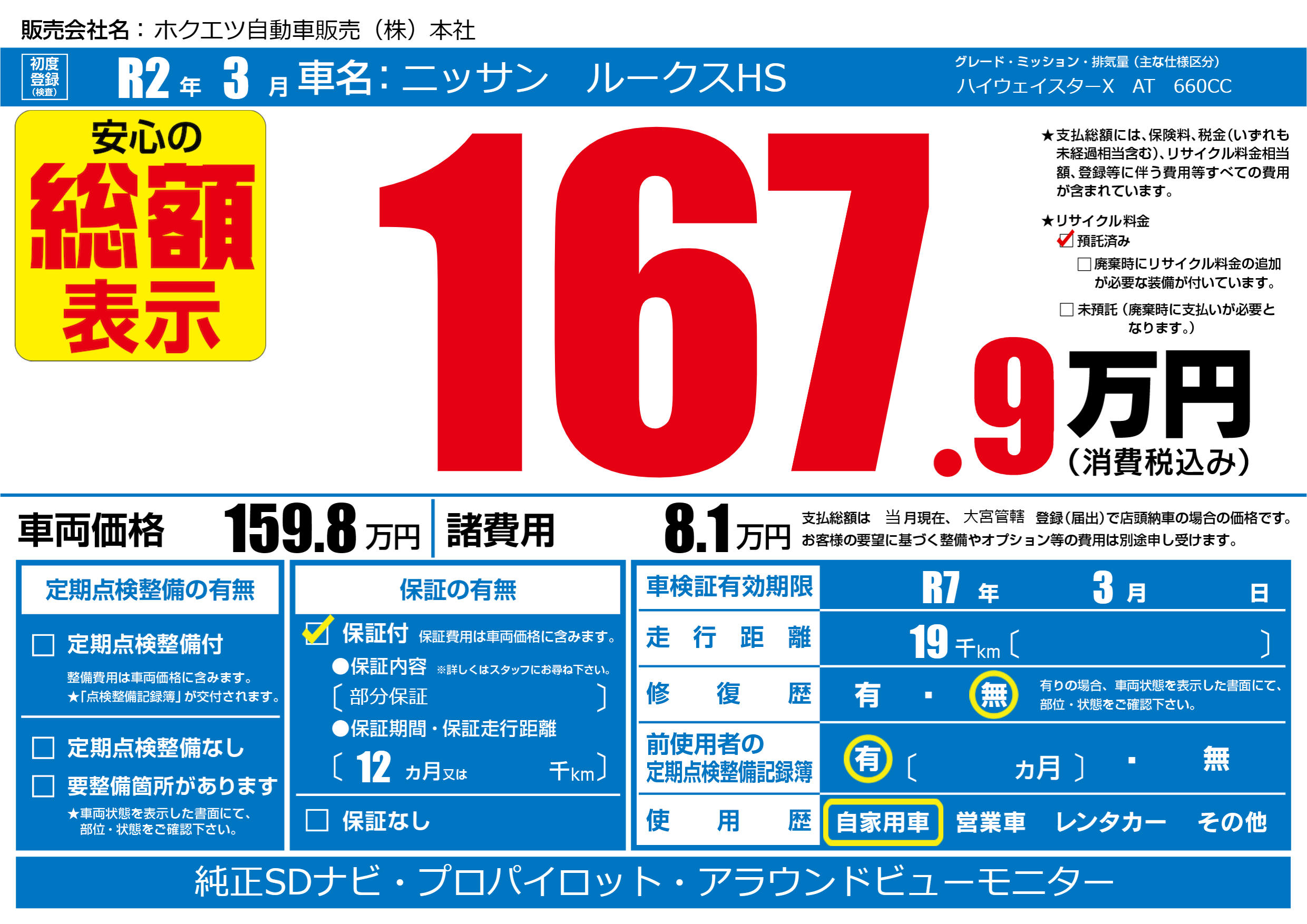 | 車検制限 | R7 年 3月 - 日 | ||
