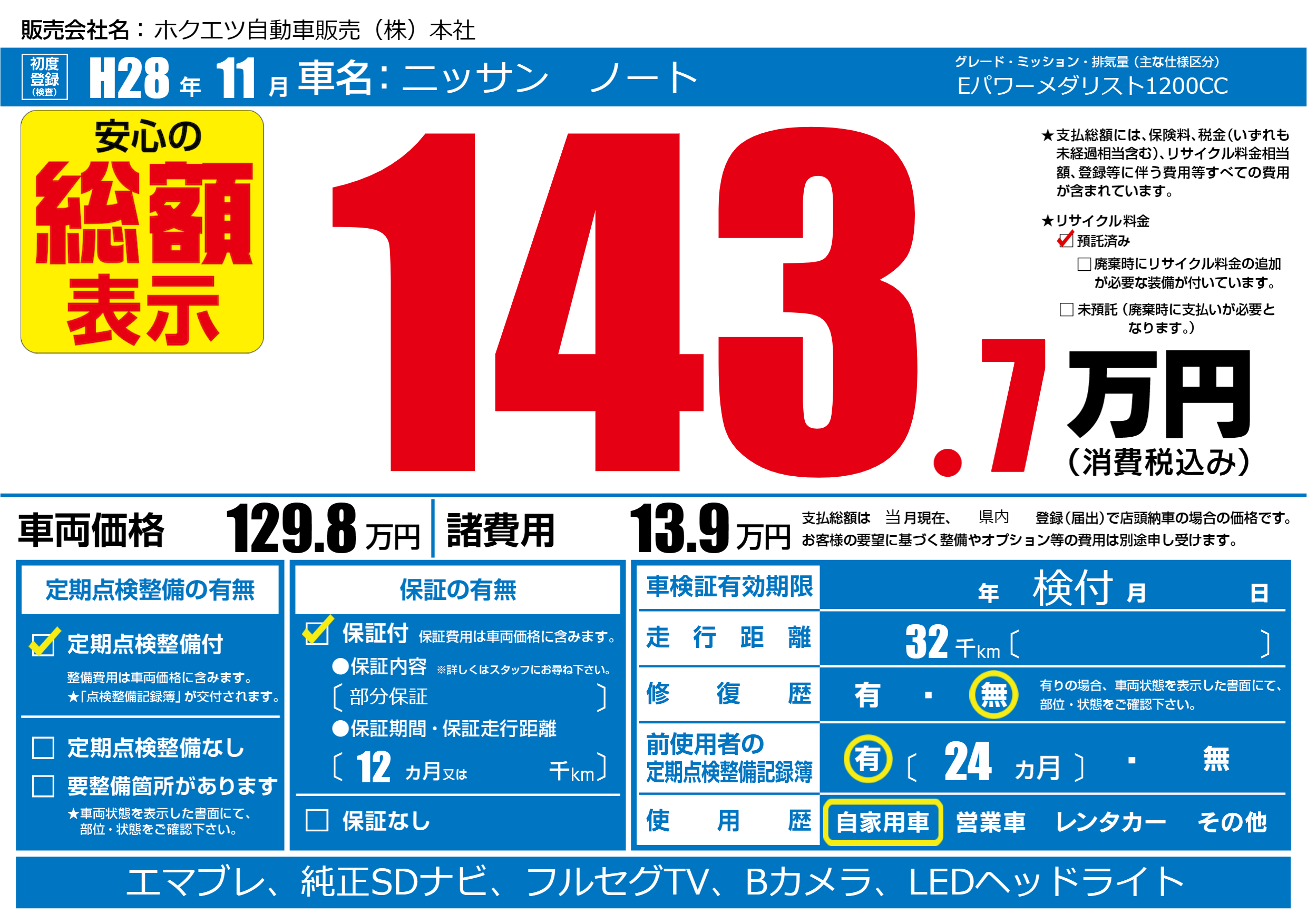 | 車名 | ニッサン ノート | グレード ミッション 排気量 |