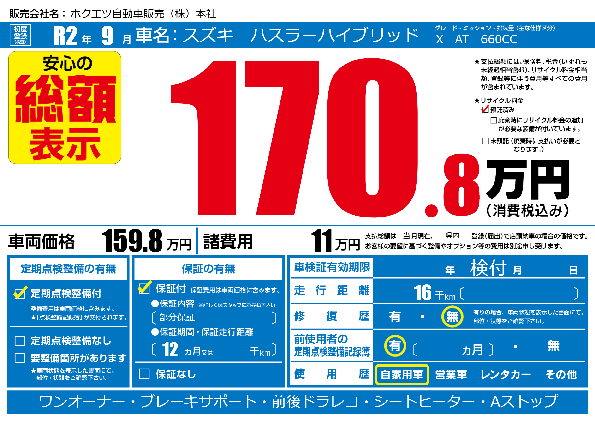 | 車名 | スズキ ハスラーハイブリッド | グレード ミッション 排気量 |
