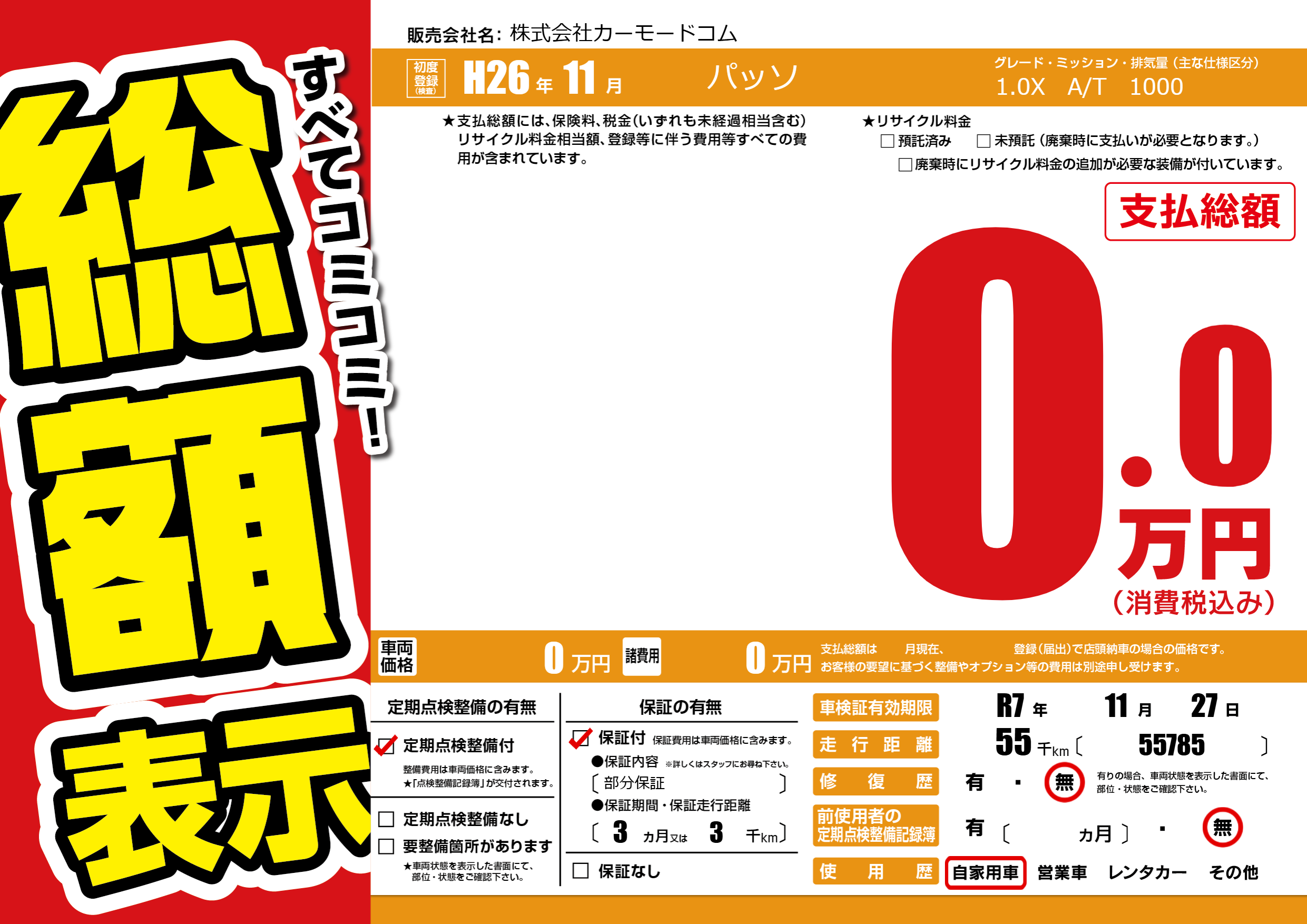 | 車名 | パッソ | グレード ミッション 排気量 |