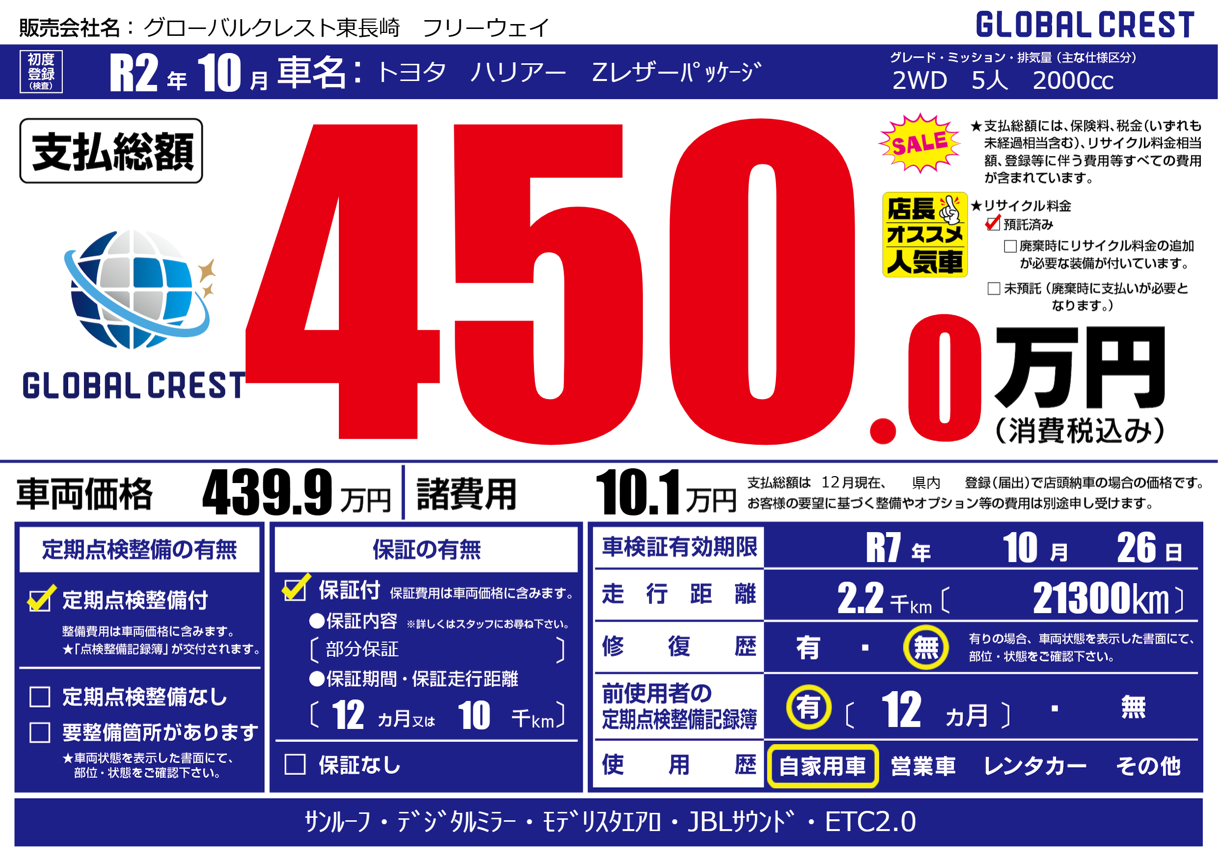 | 走行キロ | 0.2万km | 初年度登録 | R2年10月 |
