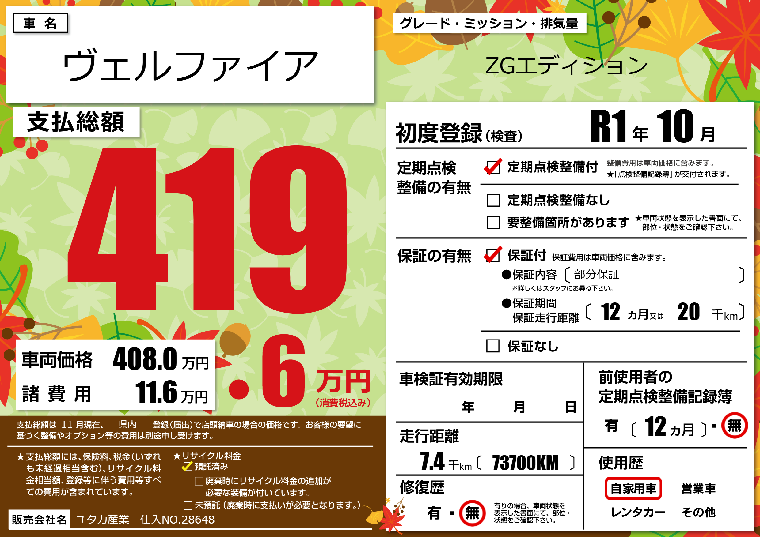 | 車名 | ヴェルファイア | グレード ミッション 排気量 |