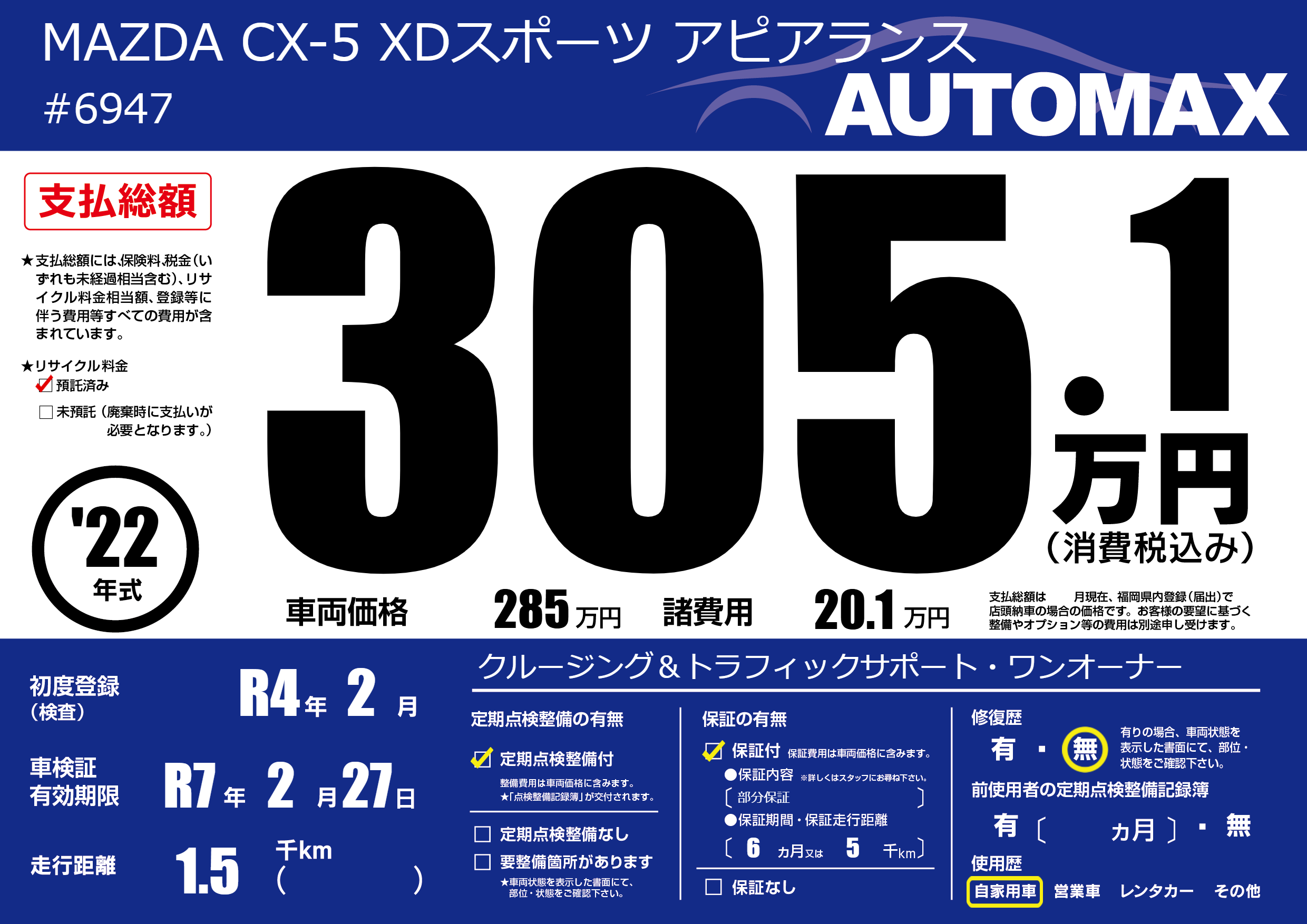 保証付き 保証内容(部分保証) 6ヶ月または(5)千kmまで |