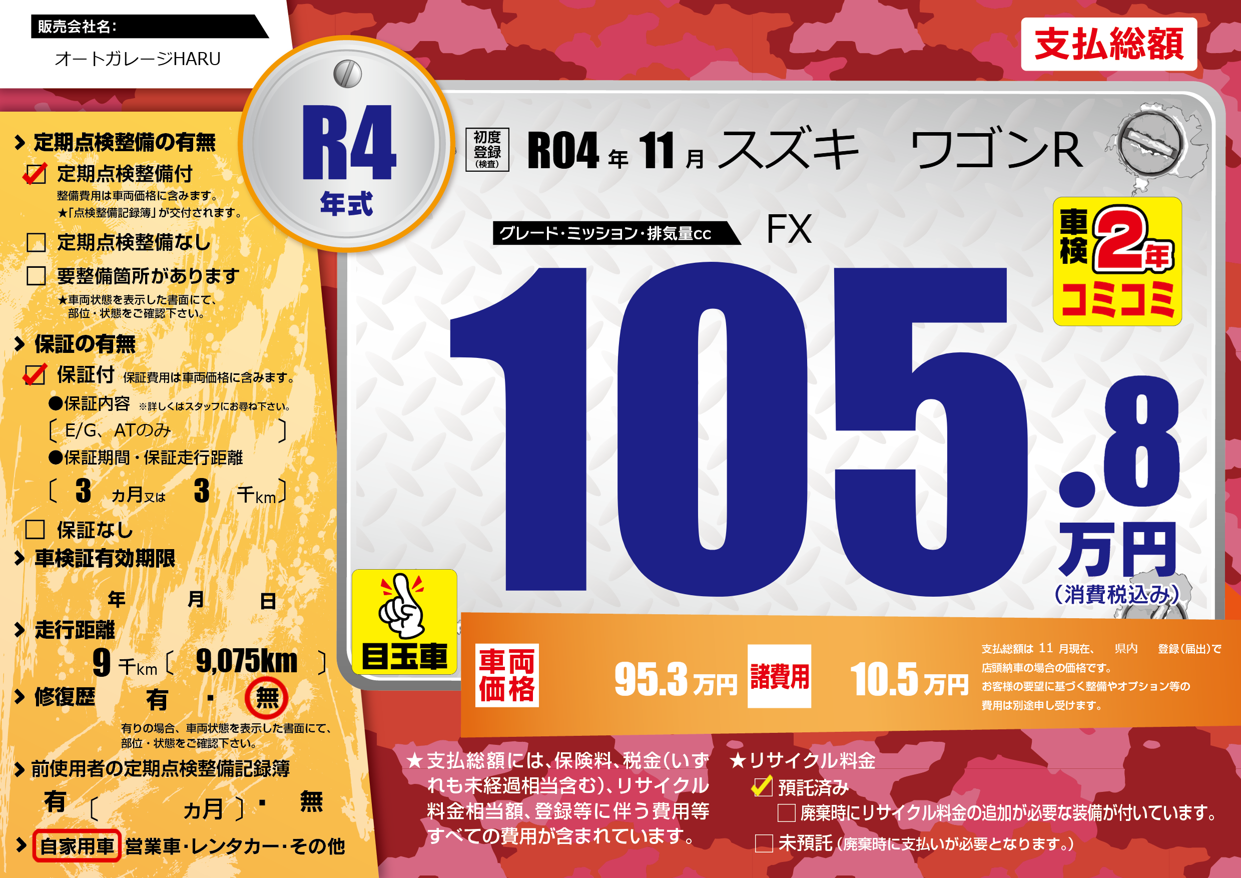 | 車名 | スズキ ワゴンR | グレード ミッション 排気量 |