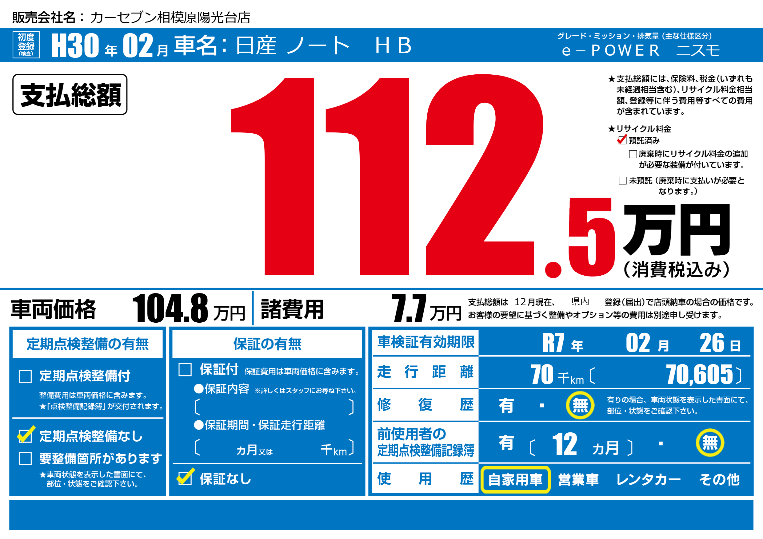 | 車名 | 日産 ノート HB | グレード ミッション 排気量 |