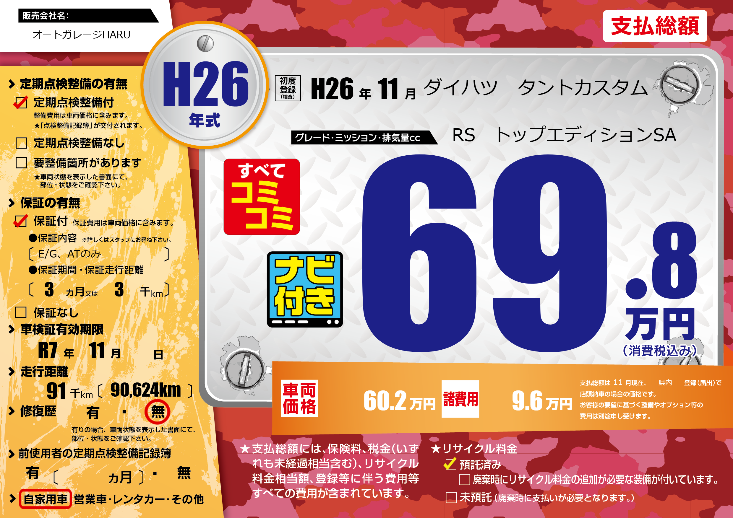 | 走行キロ | 9.1万km | 初年度登録 | H26年11月 |