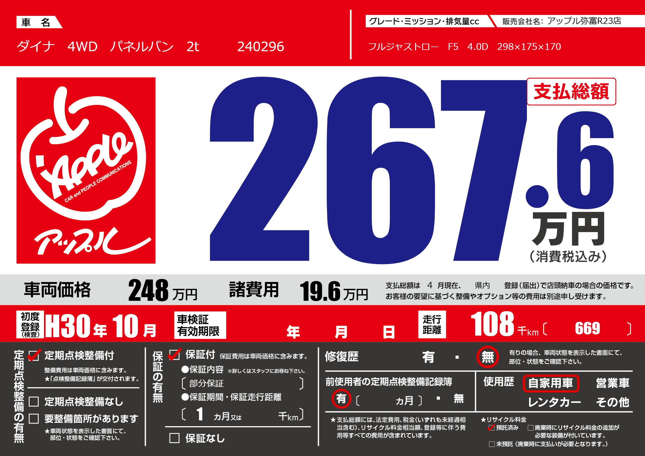 | 車名 | ダイナ 4WD パネルバン 2t 240296 | グレード ミッション 排気量 |