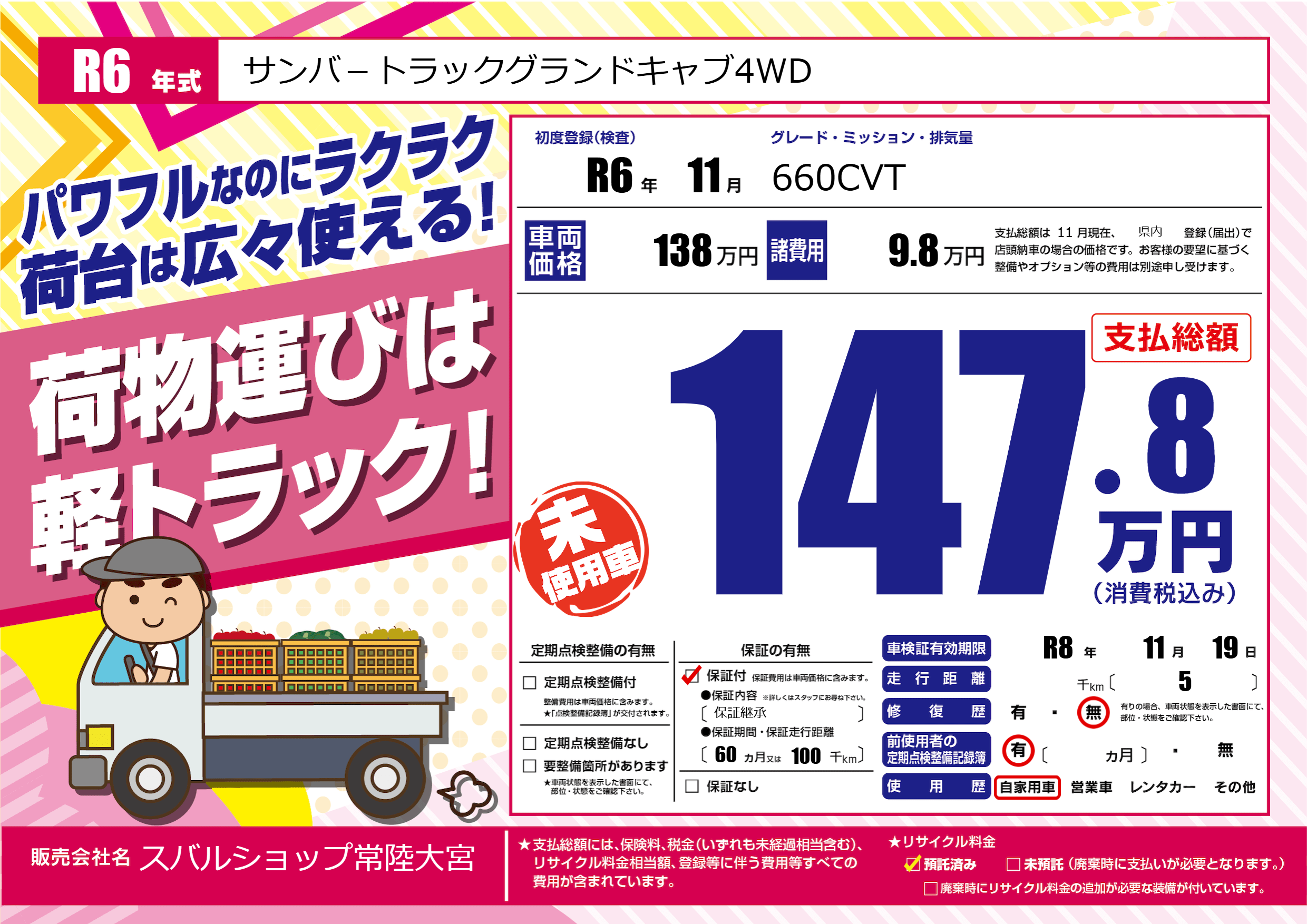 | 車名 | サンバ-トラックグランドキャブ4WD | グレード ミッション 排気量 |