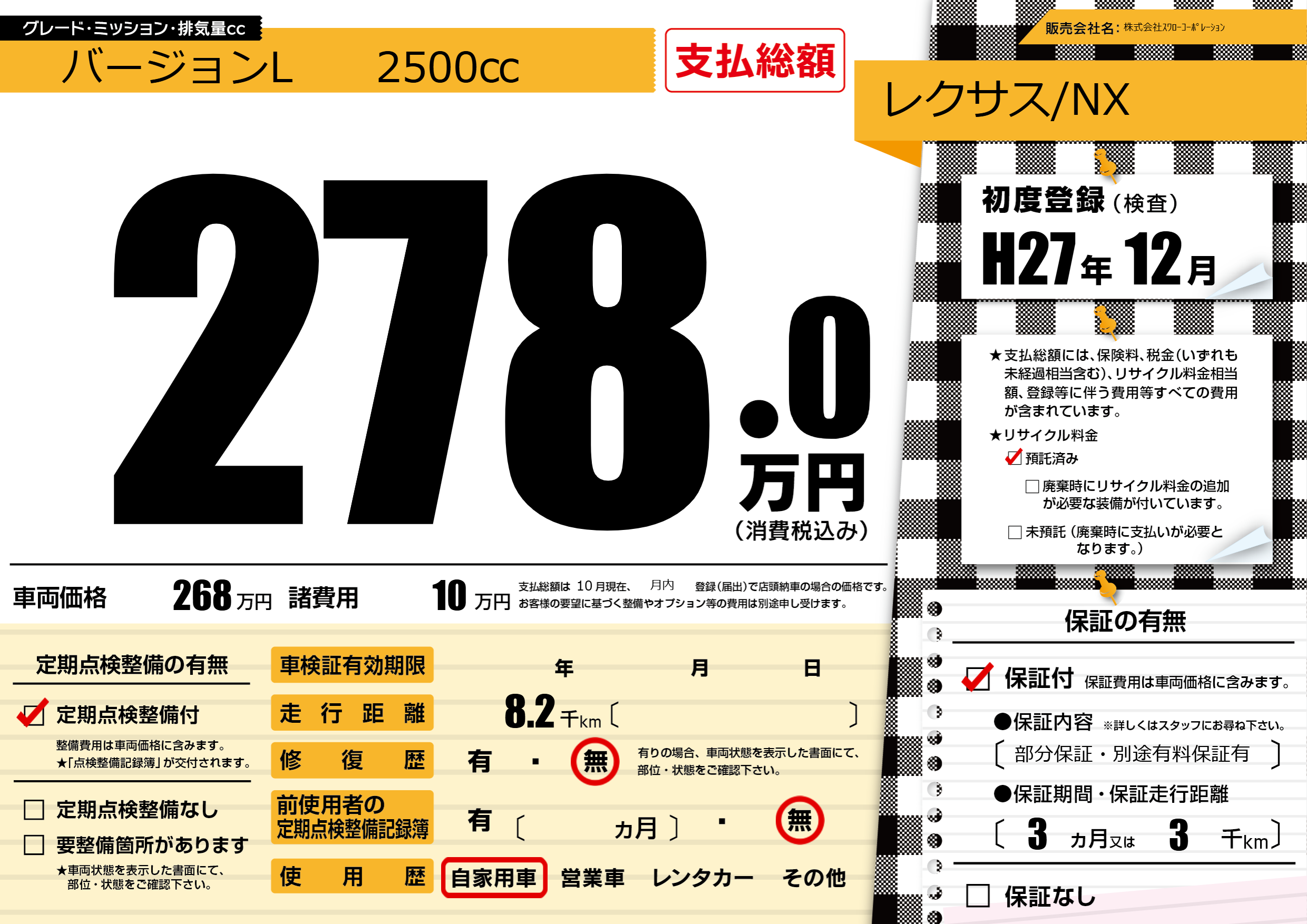 | 車名 | レクサス/NX | グレード ミッション 排気量 |