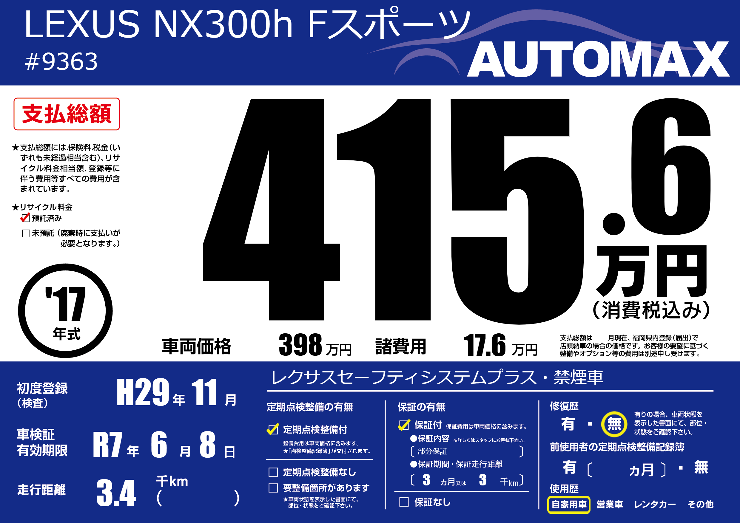 | 車名 | LEXUS NX300h Fスポーツ | グレード ミッション 排気量 |