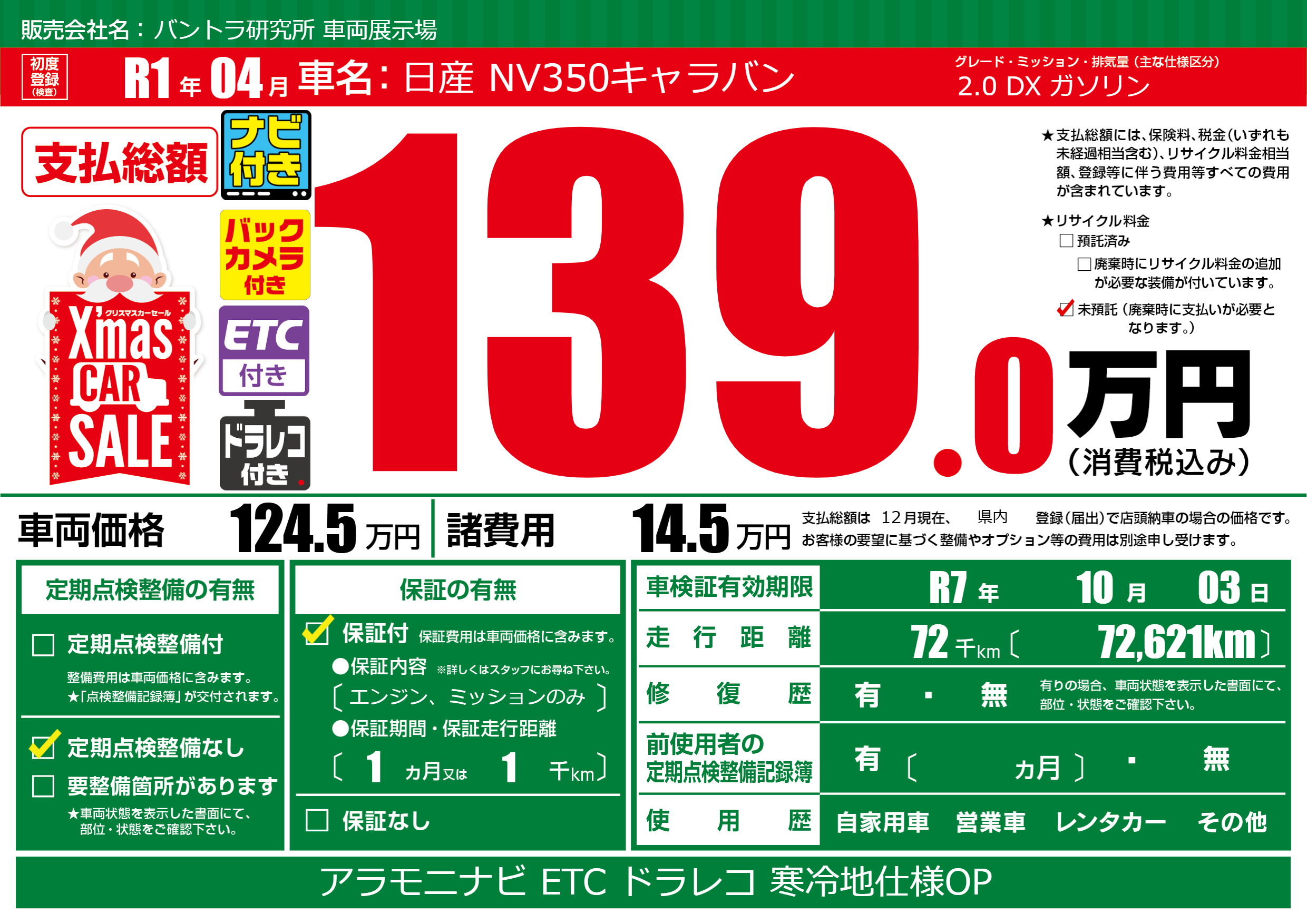 | 車名 | 日産 NV350キャラバン | グレード ミッション 排気量 |