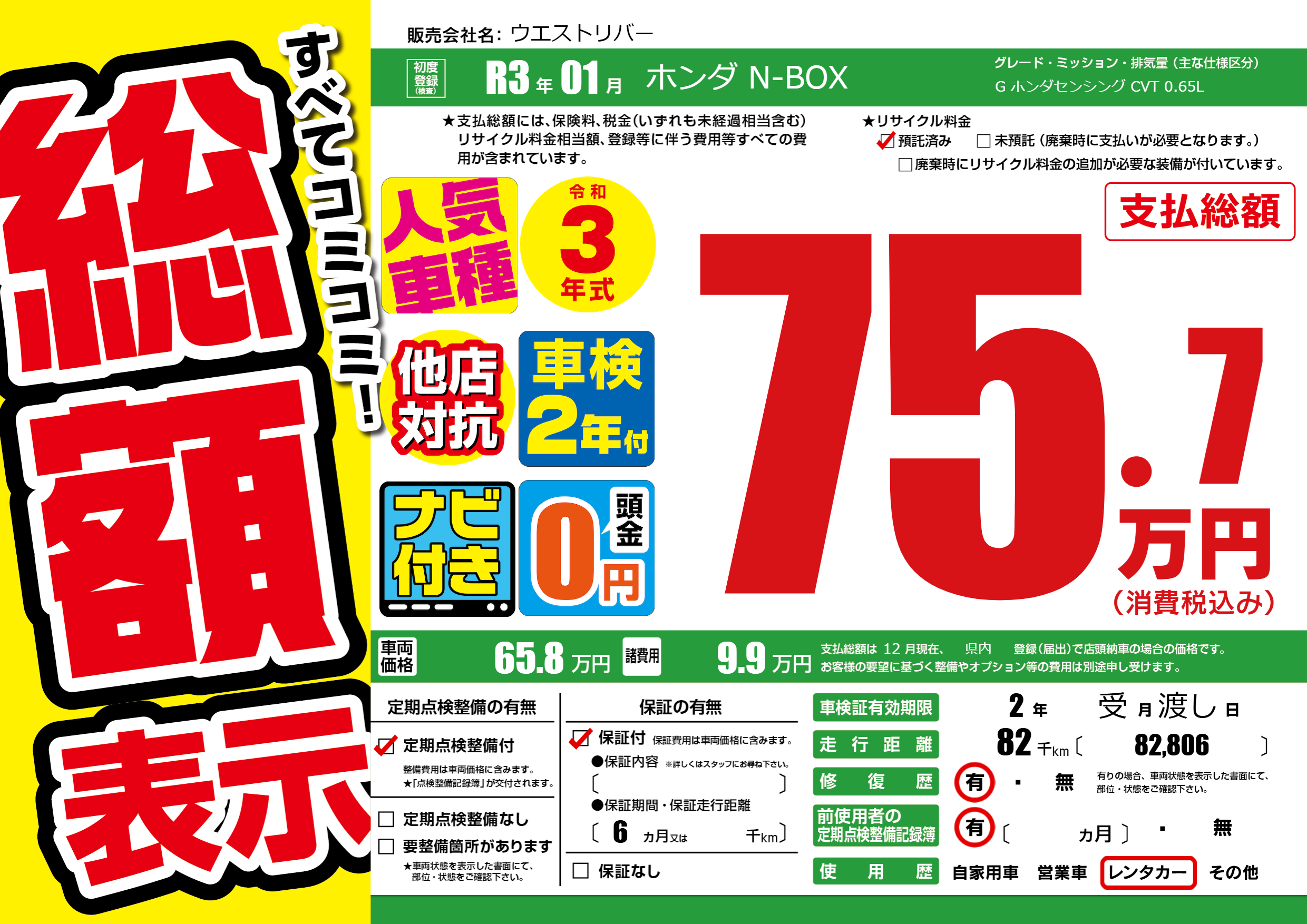 | 車名 | ホンダ N-BOX | グレード ミッション 排気量 |