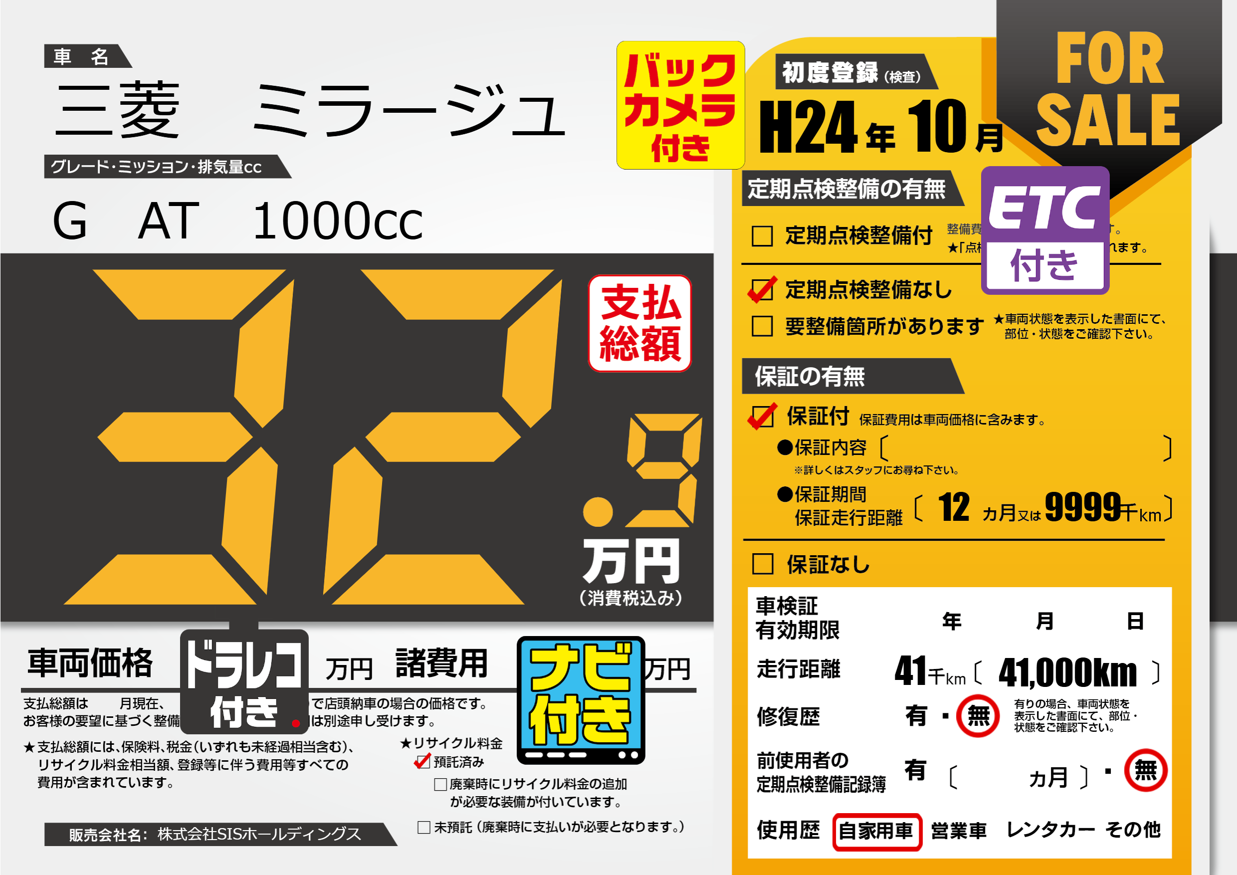 保証付き 保証内容(---) 12ヶ月または(9999)千kmまで |