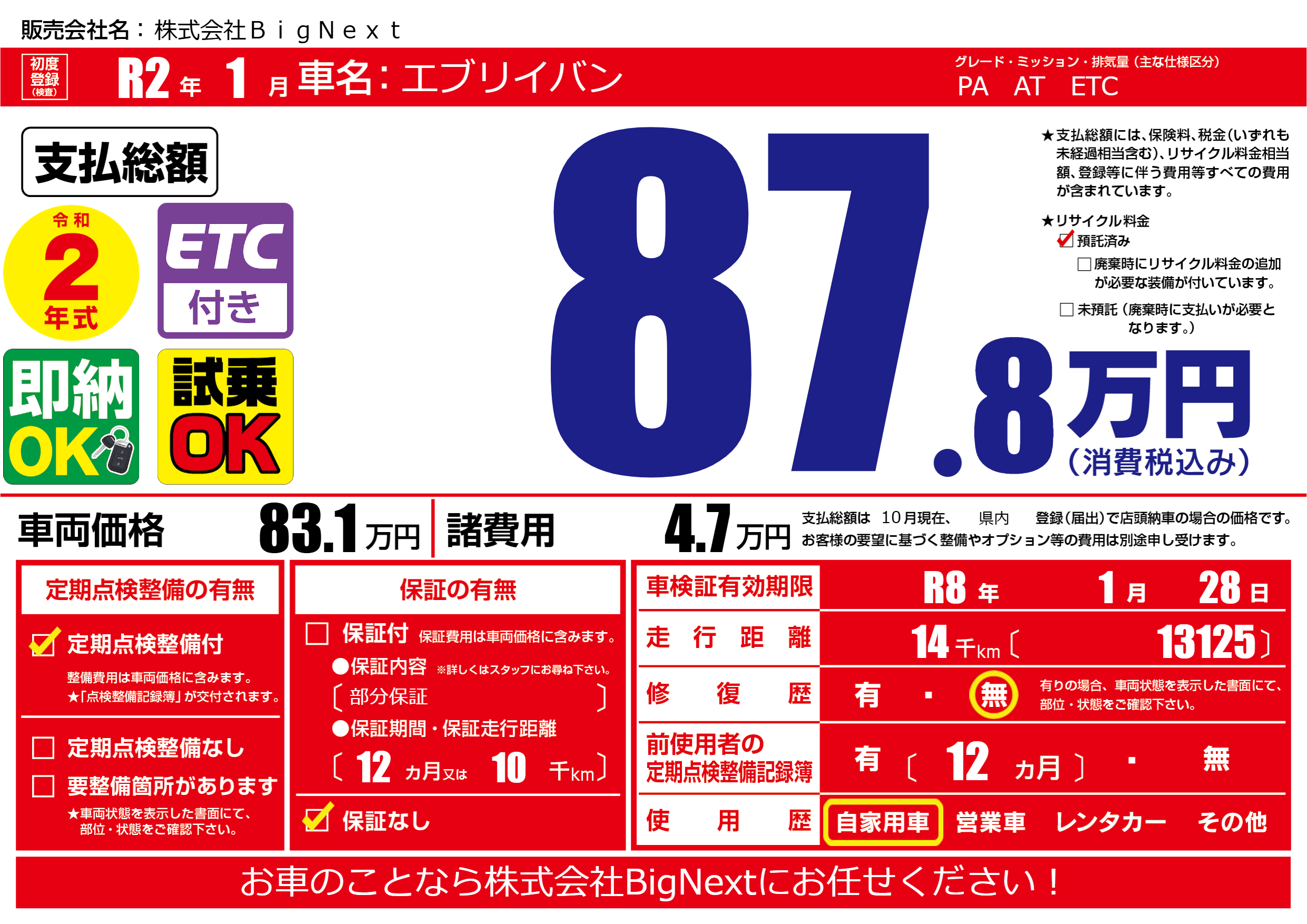 | 車名 | エブリイバン | グレード ミッション 排気量 |