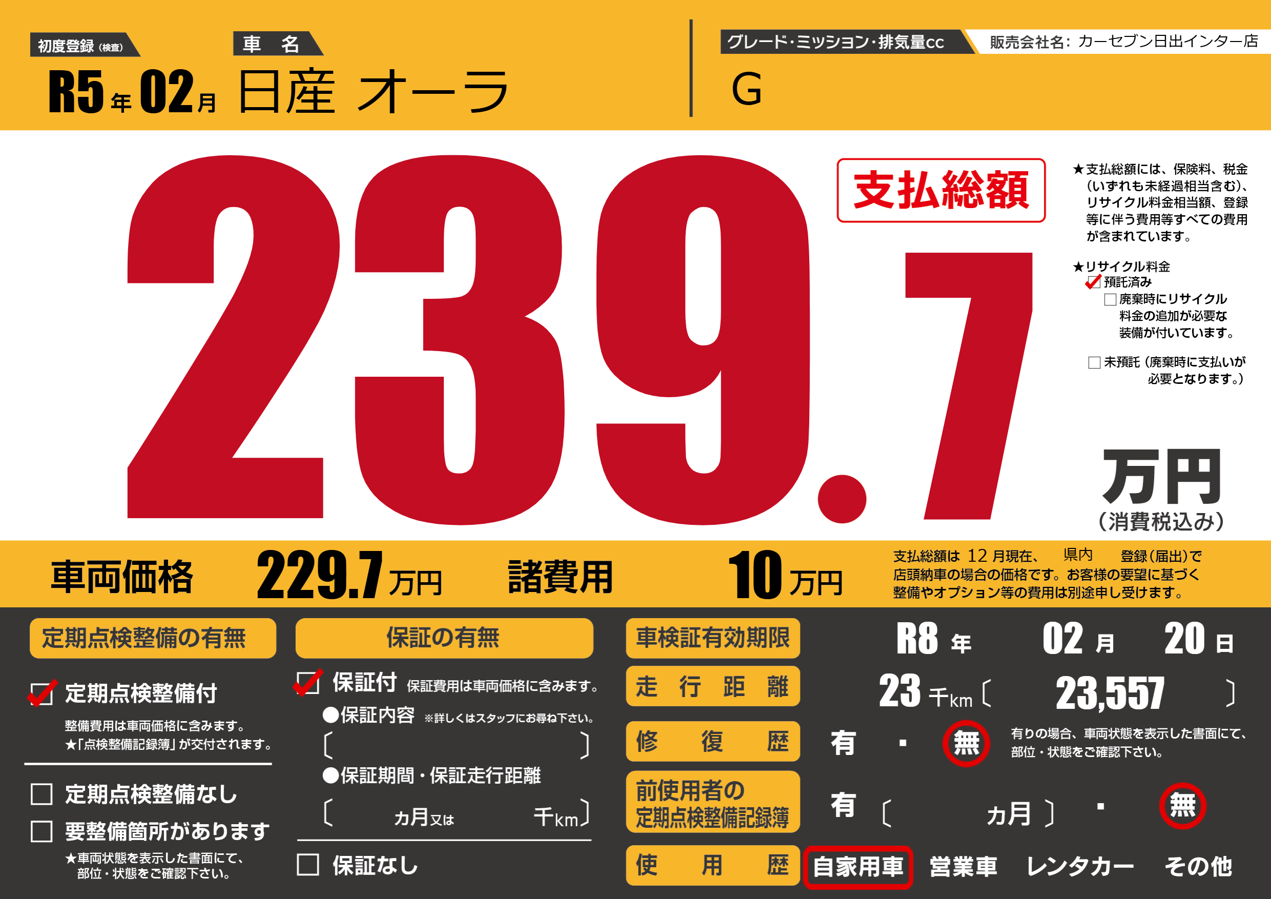 | 車名 | 日産 オーラ | グレード ミッション 排気量 |