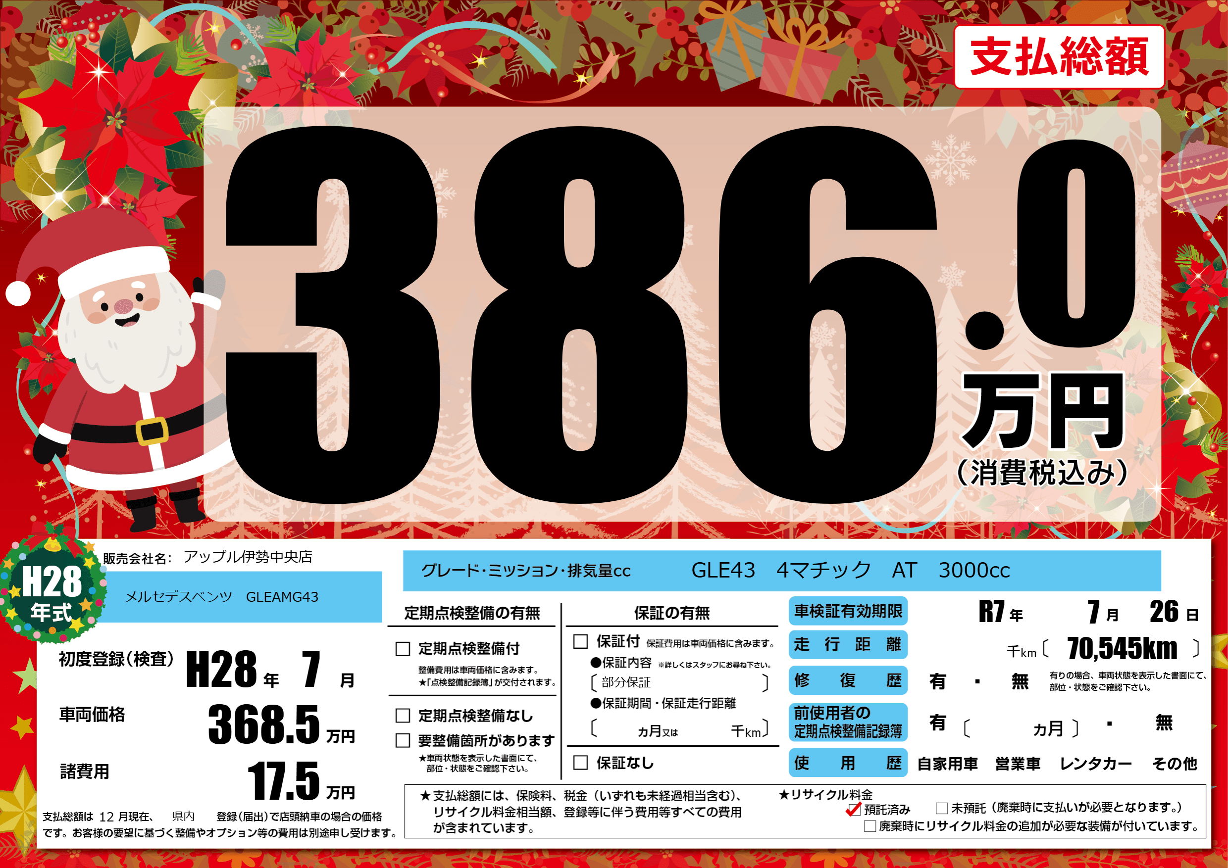 | 車名 | メルセデスベンツ GLEAMG43 | グレード ミッション 排気量 |