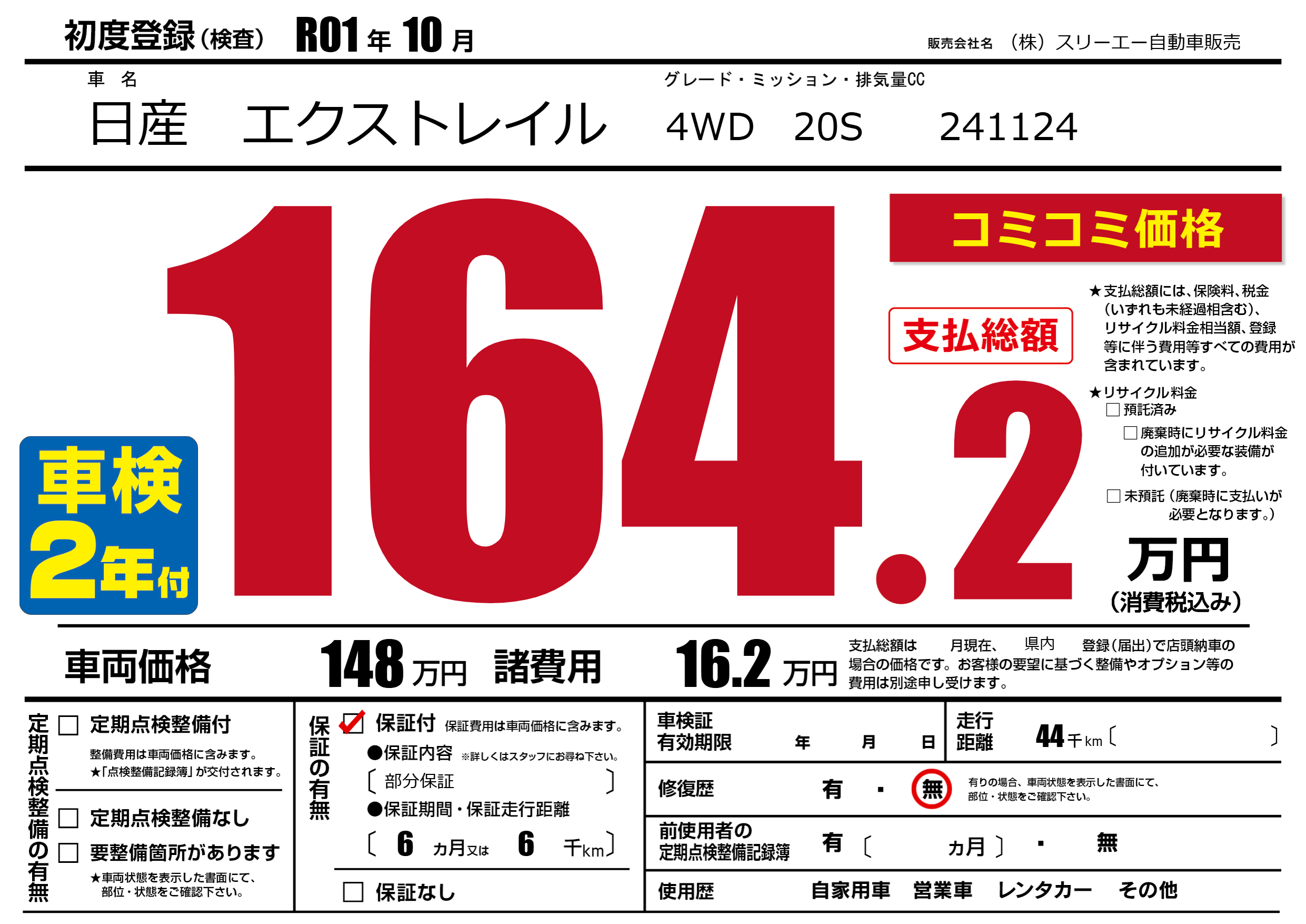 保証付き 保証内容(部分保証) 6ヶ月または(6)千kmまで |