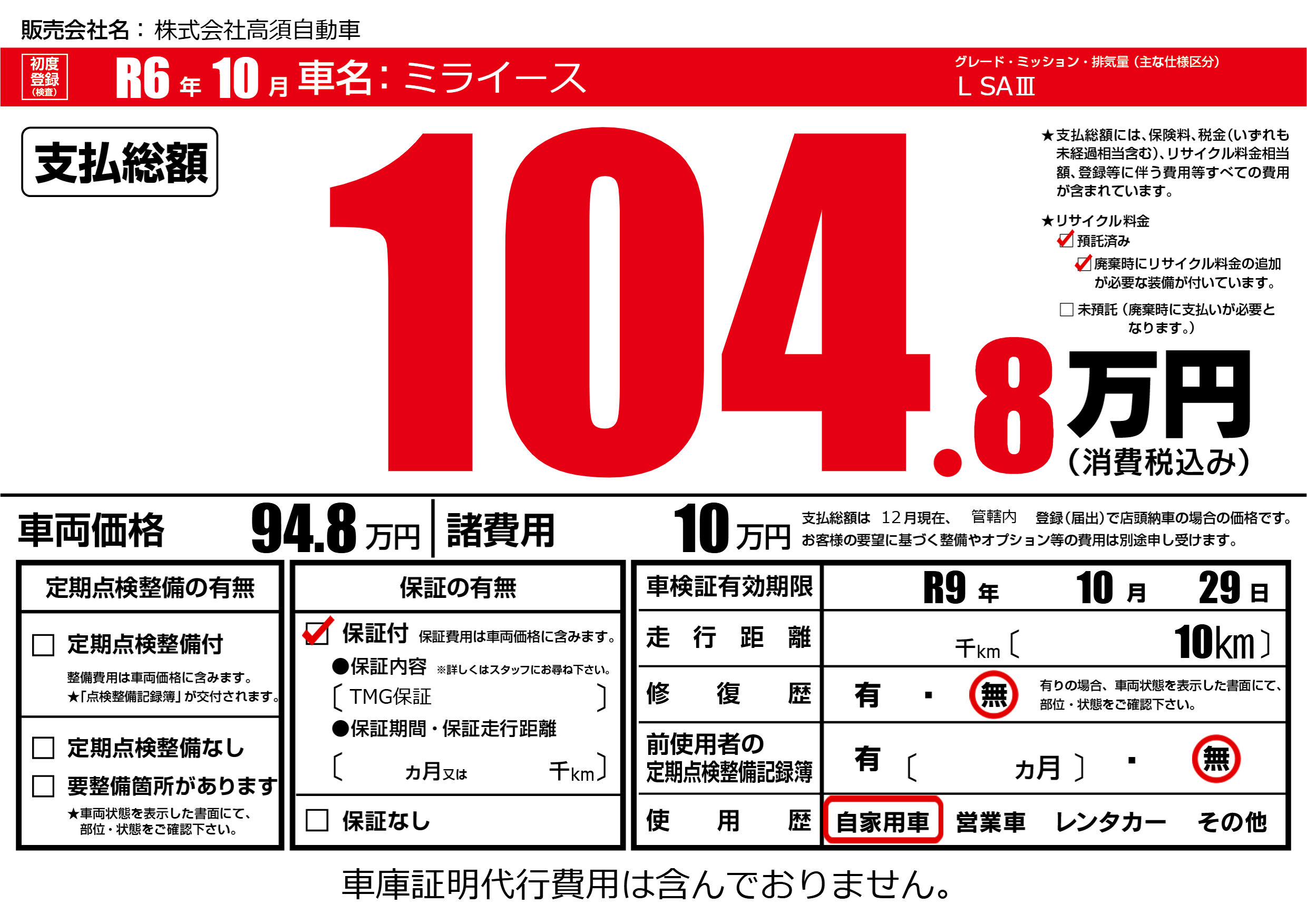 保証付き 保証内容(TMG保証) ---ヶ月または()千kmまで |