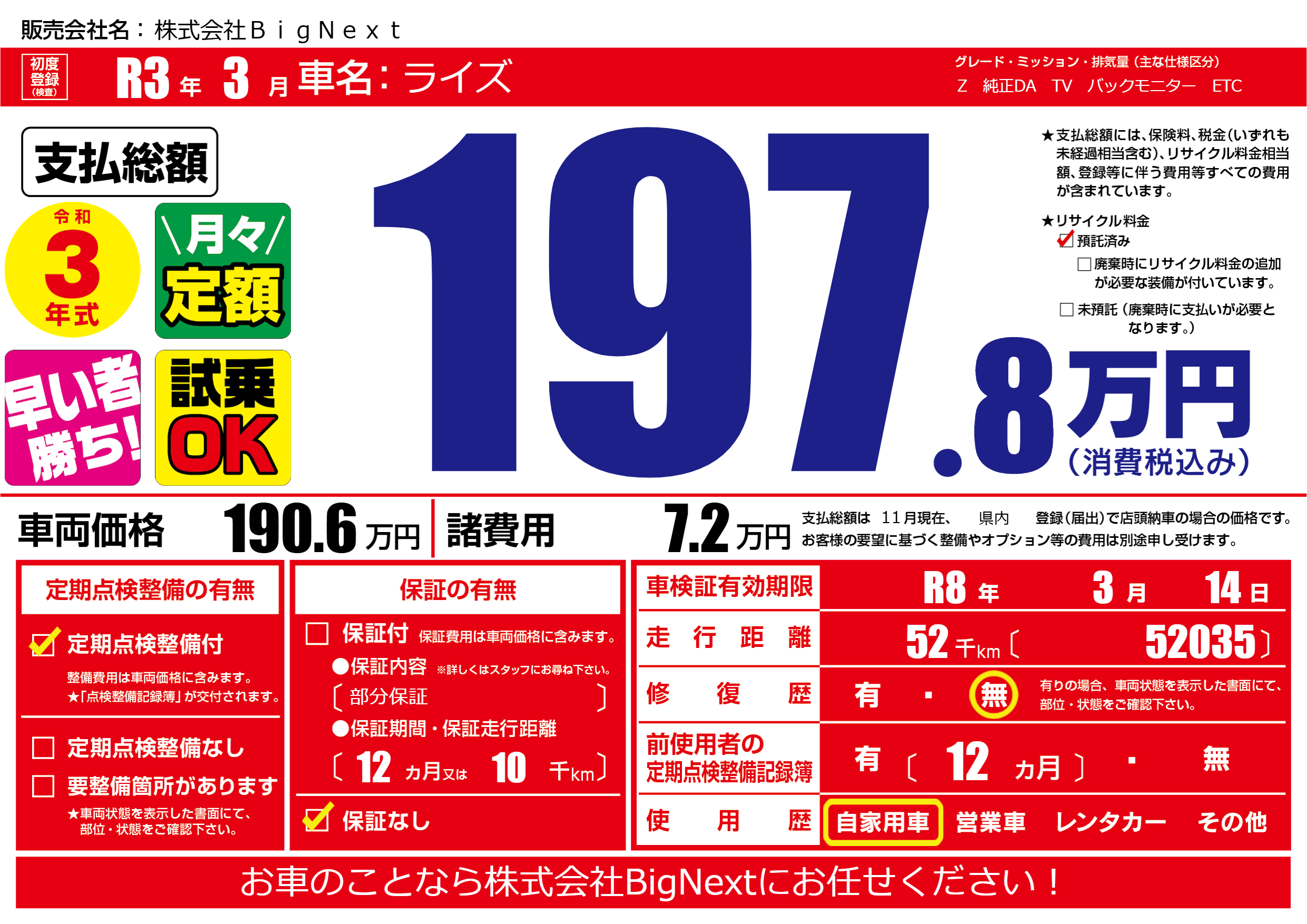 | 車名 | ライズ | グレード ミッション 排気量 |