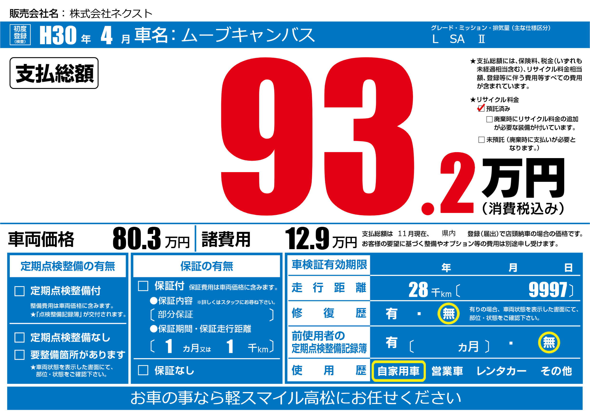 | 走行キロ | 2.8万km | 初年度登録 | H30年4月 |